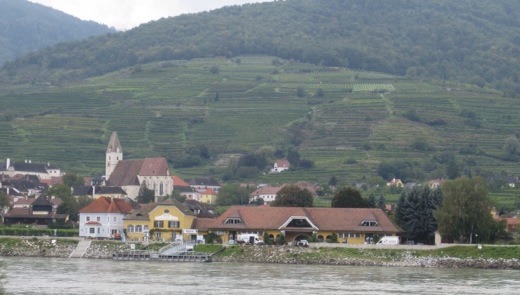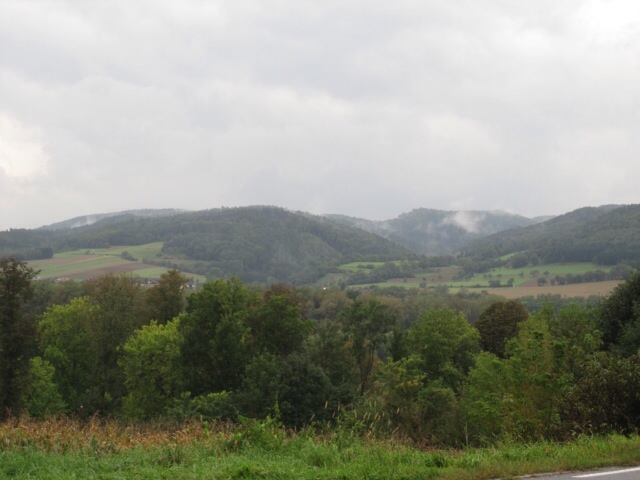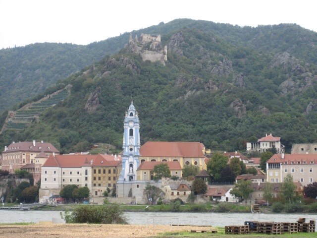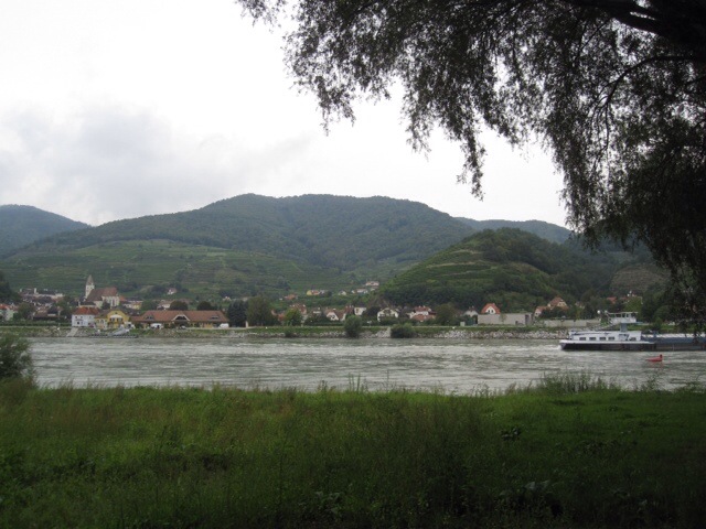 Angie and I had settled on Tulln as our destination for today for a couple of reasons. First, we are scheduled to arrive in Vienna tomorrow and we know that biking into a large city is challenging and stressful enough without having been on the bike for several hours beforehand, so we wanted to get relatively close. Second, it was one of the few places between Melk and Vienna that had any places to stay with vacancies at any price. So, we knew it would be a long day, especially now that the weather has turned autumnal and there are leaves and other messy things on the ground. When we map out the route beforehand we know that the mileage is approximate, but we expected we’d be riding close to 50 miles today, and that’s what it turned out to be, a touch under 50 miles. As I said, the weather conditions were not the best, but we managed to see some cool things along the way. We were riding through Austria’s wine country for the biggest chunk of the day and the scenery, even with the heavy clouds, was lovely, as you can see from these pictures.