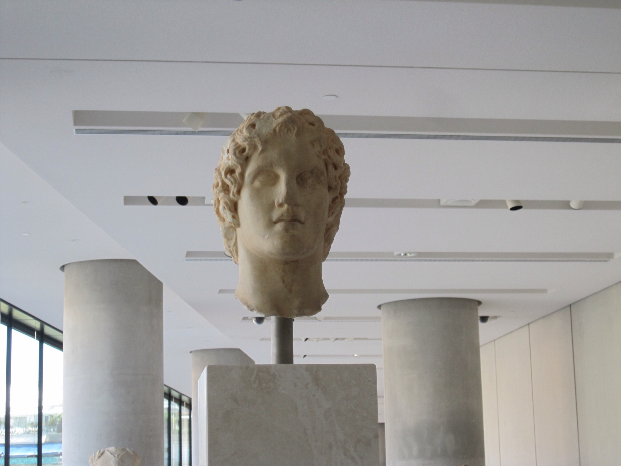 The museum lobby holds models of the Acropolis over the years, so much of the history of Athens that we heard and read about yesterday was reinforced. You then ascend a ramp containing ancient artifacts unearthed on the hillside below the Acropolis. The next two levels contain statues and pediments (statue-like elements over the entrance) from the temples that occupied the Parthenon site. These statues also illustrate the development and progression of artistic styles. One particularly striking piece was the head of Alexander the Great, believed to be done from life.