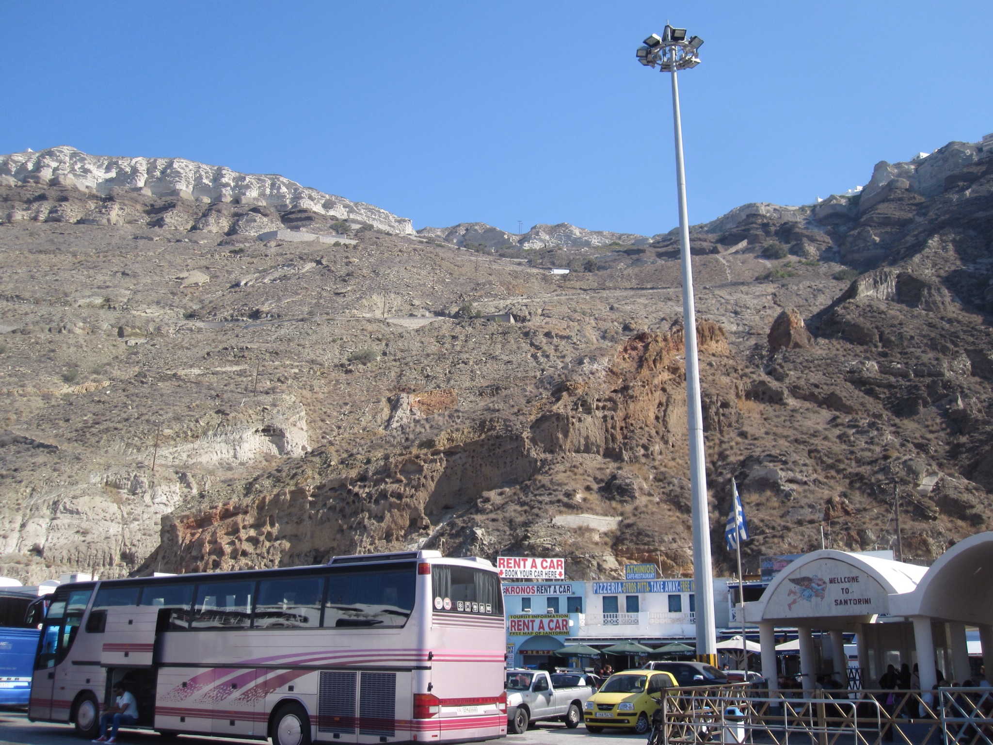 Next we headed for the bus “terminal.” In Santorini, that’s a parking lot in which the buses back up with amazing ease into slots next to one another. We were early, so we waited (with many others) until someone shouted “port” and pointed to a bus. We survived the resulting melee and got seats on the first port bus. As with our bus back from Oia, they fill one, then start another until they get everyone down the hill. Yes, the hill. If you don’t like heights, think long and hard before you go to Santorini. If you go by ferry, you have no choice but to ride up the hill (and eventually back down) in a bus or private car. It is steep and on the side of a cliff overlooking the caldera. Beautiful and awful. If you come by cruise ship, you can choose cable car or donkey trail. I guess you could fly–the airport did seem to support full size aircraft and was on the flat portion of the island…