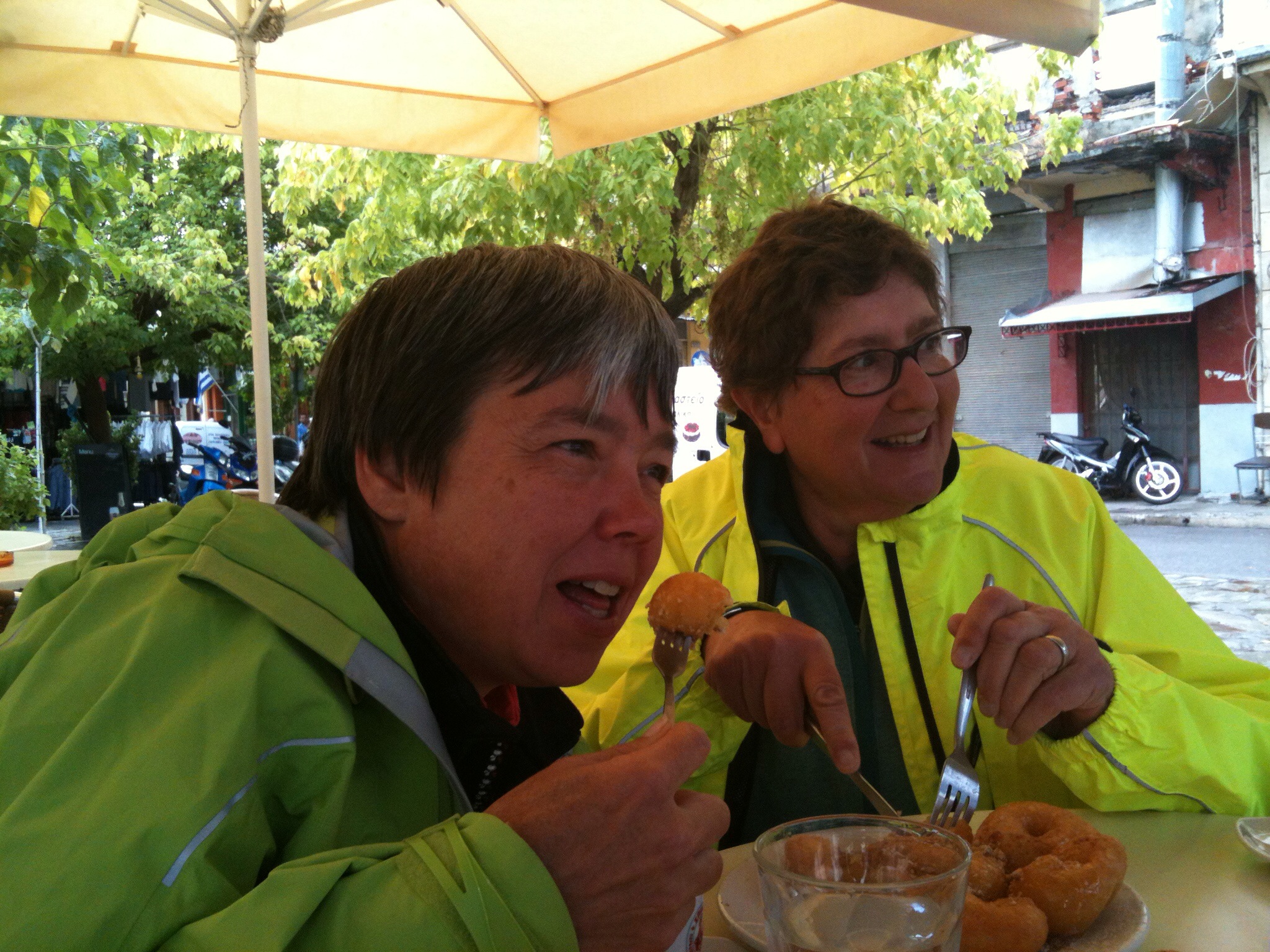 But I should start at the beginning. This has really been a two-day transition. We left Pam and Dermot’s yesterday morning and headed for Kalamata. We were able to enjoy some loukoumades, get a sandwich and a cookie for the bus at Athanasiou (our Boston friends can access their wonderful baked goods at Athan’s), and visit the delightful Saturday market, where we acquired salt and honey and Pam acquired beautiful vegetables and fruits.