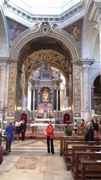 After our late night at the museum on Friday, we opted for an easy start on Saturday. My mom wanted to attend Mass in Rome for All Saints Day–the problem was deciding where to go! We opted for a church on the busy Piazza del Popolo (there are three), the Basilica of Santa Maria del Popolo. The Basilica contains art by Raphael, Bernini, and Caravaggio, among others, and has many masses on holy days. Moving at less than warp speed, we made it there in time for a 12:00 service. {Maureen’s note: This church has a side chapel that was designed by Raphael for his buddy Agostino Chigi, who was a wealthy banker. Later on, Chigi’s great-grandson had my new hero Bernini sculpt two of the statues in the chapel. I enjoyed looking at them but didn’t get much of a look at the two Caravaggio paintings in one of the other chapels, since it had a huge crowd in front of it, plus I find his stuff really intense and less interesting. Angie and I didn’t know why fewer people were looking at the Chigi Chapel.} Maureen and I enjoyed a walk and local art show instead of staying for Mass, but our sources report that it was in Italian (selected Masses in selected churches in Rome are conducted in Latin) and that a baptism took place. Even so, it was over in about 40 minutes. (Thanks to Mom for all of today’s photos!)