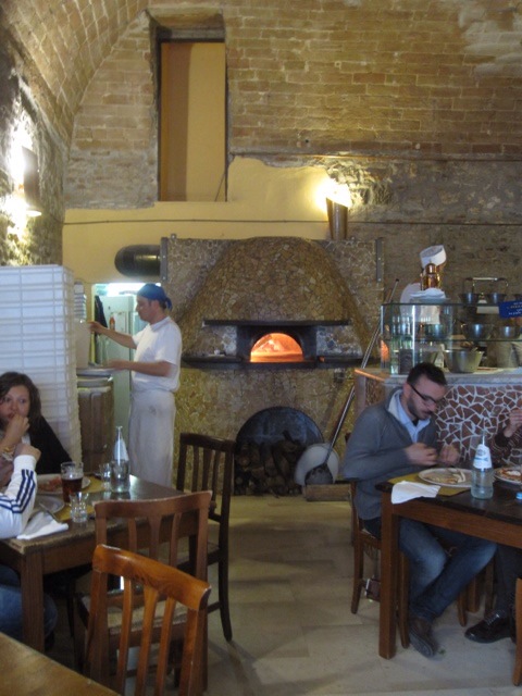 Back to the story. We trekked up and up, climbing some shallow but steep steps. Janet and Pat wanted to give up and just pick a random place, but suddenly, we were there. We walked into a full restaurant and the warm glow of a real wood burning pizza oven.