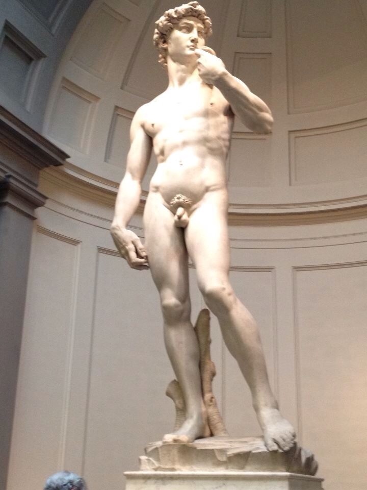 There are elements of the sculpture that look out of proportion to the rest of the figure because Michelangelo was originally asked to sculpt it to be placed on the roof of the Cattedrale di Santa Maria del Fiore, so it would be seen from below. However, it was never placed there. It sat for a while at the entrance to Palazzo Vecchio (and you can see the wear and tear from the elements in some places) but then it was moved inside the Galleria under its own purpose-built dome and a copy erected at the Palazzo.
