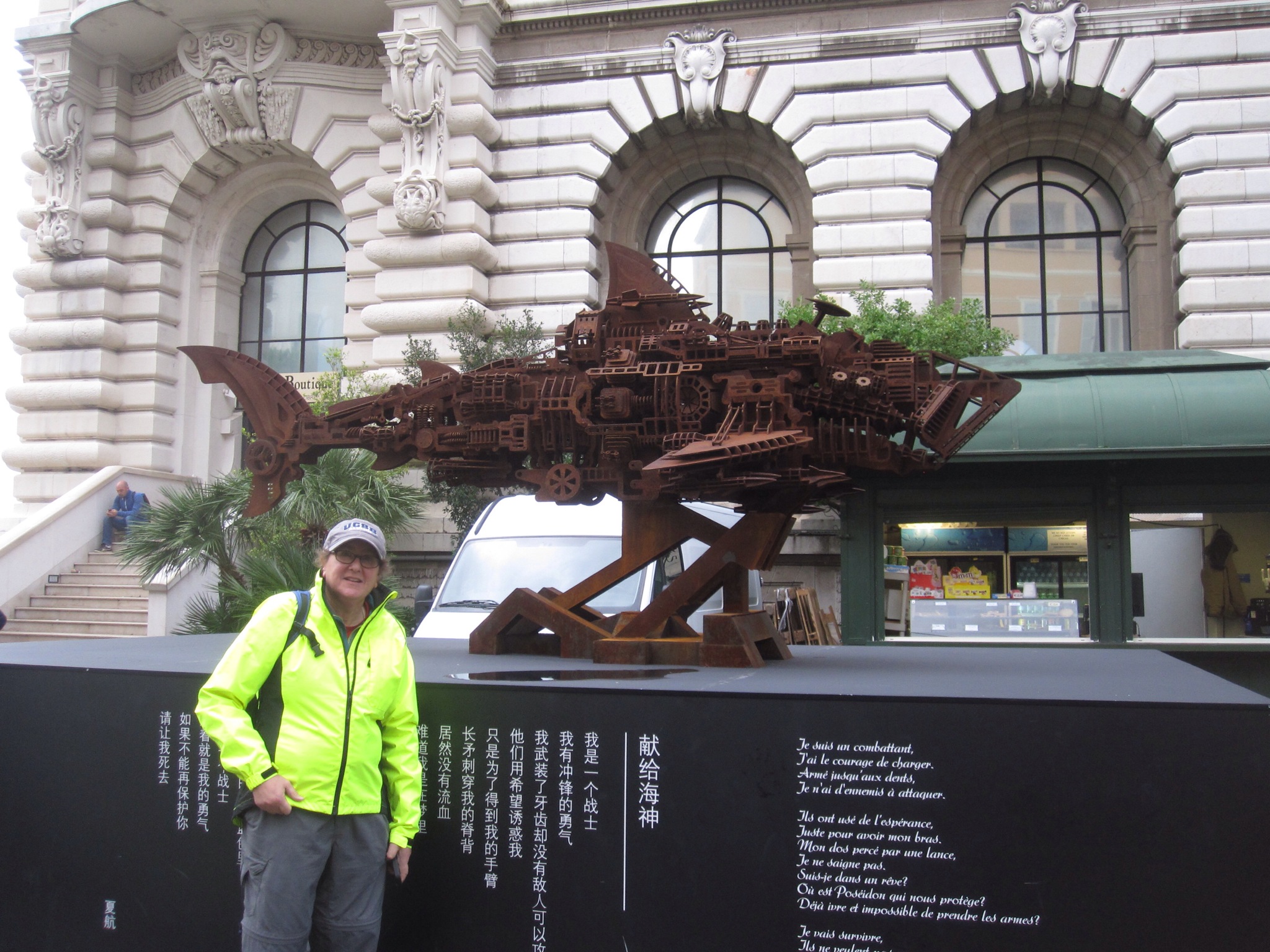We went in the museum and, noting it was noon, directly to the rooftop café. Good move. It was already buzzing when we sat down, but got much more crowded over the next hour. Many families were apparently spending the holiday at the aquarium. I enjoyed moules et frites (better than in Belgium), while Maureen had entrecôte. Not bad for a museum café.