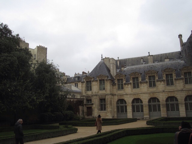 The building had peaceful courtyards and a bookstore that had some very appealing books, though not many in English, and the last section of the property took us onto Place des Vosges, which I may have mentioned before. This lovely square was built by Henry IV as part of his gentrification plan and it’s lovely. There are some art galleries with some very interesting pieces and I’m sure the cafés etc. are quite nice too. Victor Hugo lived there for many years, including when he wrote Les Miserables.