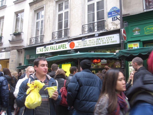 Inevitably (for us) lunch was at L’As du Falafel (no website). I don’t think there was such a long line when we were there in the summer in 2011, though it’s always busy. They seem to have gotten pretty organized about it, giving out numbers and approximate wait times. We waited less than the estimation of 25 minutes we had been given.