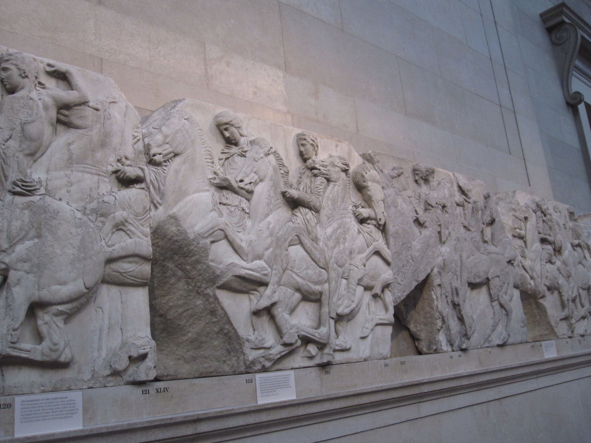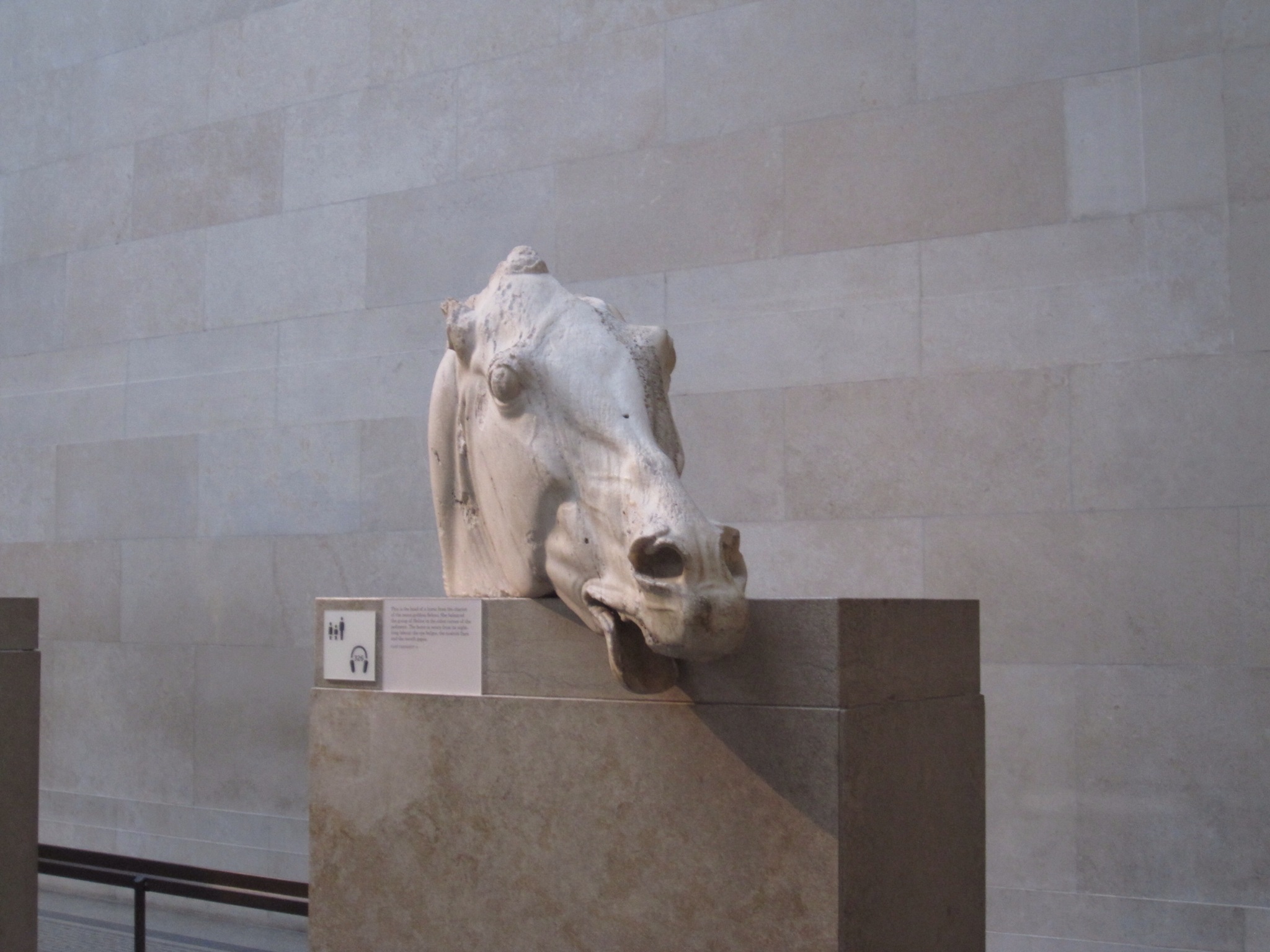 The British Museum, by the way, is a free attraction, so one can definitely feel good about “popping in” just for a particular exhibit or artifact. Our mission at the British Museum was to see the Parthenon/Elgin marbles, the story of which we had repeatedly heard (from the Greek perspective) during our time in Greece. The Acropolis Museum in Athens has replicas of some of the pieces that were removed by Lord Elgin, but I wanted to see the real thing. So we went right to the Duveen Gallery to see them. The language describing how the artifacts came to be in England was interesting compared to what we read in Athens. Here, the story is that Elgin “rescued” the sculptures for preservation. The sculptures themselves are fantastic, and are displayed, with helpful descriptions, at a height that doesn’t require craning the neck.