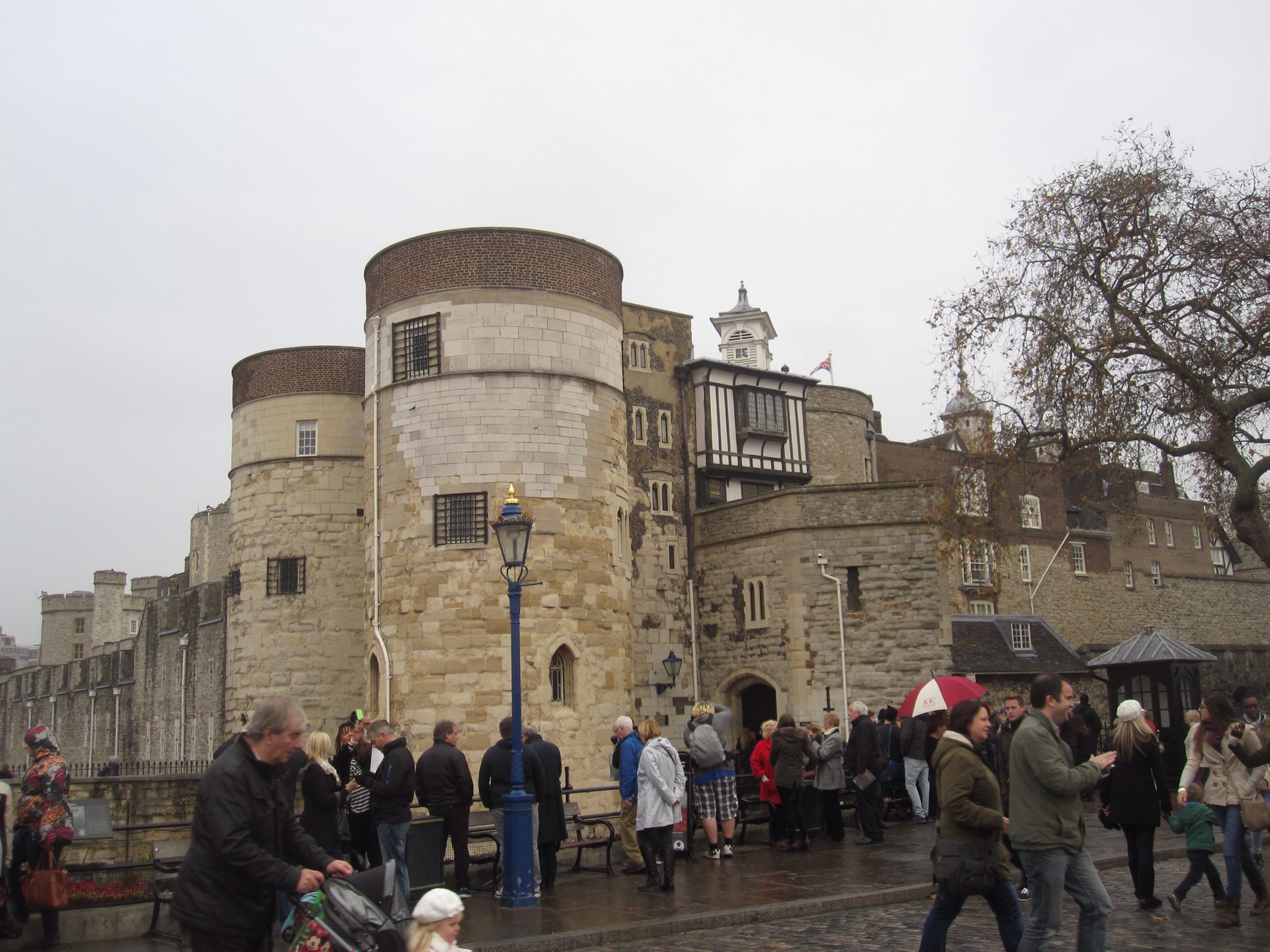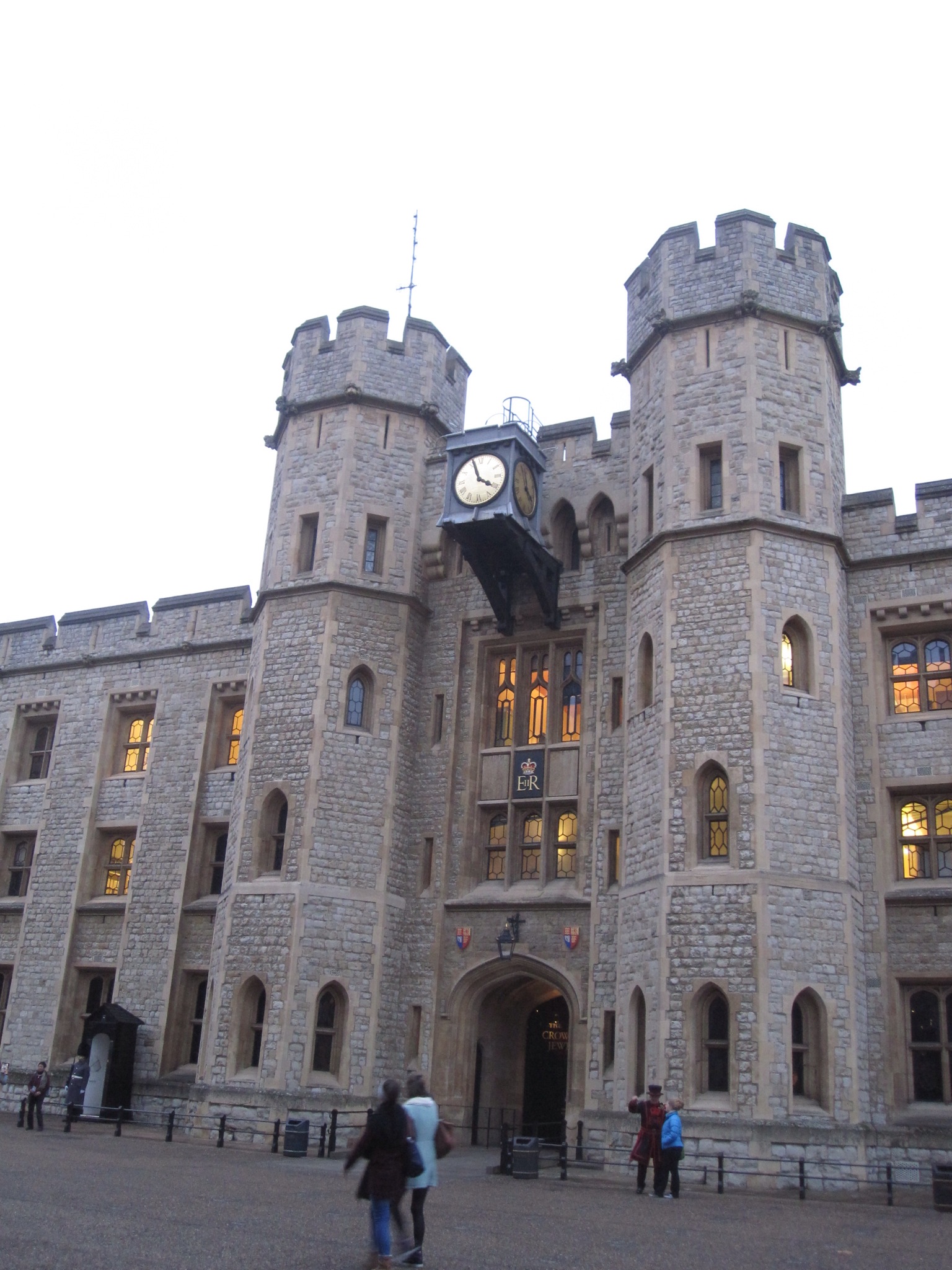 Feeling refreshed, we headed for the Tower’s star attraction–the Crown Jewels. I had no real expectations about the jewels. I ended up being pretty wowed by the jewels and this presentation. The visitor experience was recently redesigned (reopened in 2012) for the Queen’s diamond jubilee. The exhibit gives some history of the jewels, then shows the coronation festivities in “animated” films of ceremonies throughout the ages, along with actual footage of Queen Elizabeth II’s coronation. After viewing some incredible items used in other royal celebrations, you enter the room with the crowns and other coronation items. The glass cases are flanked on both sides by moving walkways! We thought this was great, especially after seeing so many sights and artifacts where people really did not “move along.” There is also a raised walkway on the far side of one of the moving walkways, that allows for a longer look, but from a bit farther away. Well done, I say. The last bit of the exhibit highlights the fact that the items are still used, showings videos of the white-glove treatment they receive and the bespoke boxes in which they are transported. Very cool.