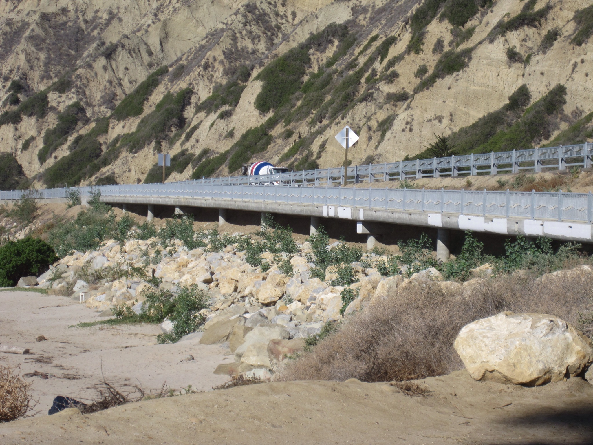 On Monday, we drove just a few miles from “Carp” to check out the new bike path along Highway 101 that some are calling the La Conchita bike path. Though just a few miles long, it is important because it removes cycle traffic from the shoulder of the highway through a stretch that previously allowed for no other options. We rode the 3.75 miles of the path along the ocean, and a bit more along the old highway, for a total of about 10 miles with Rebbe in tow. This was his first outing with his new harness, so the top of the DoggyRide Mini could be opened, allowing him a great view of the beach.