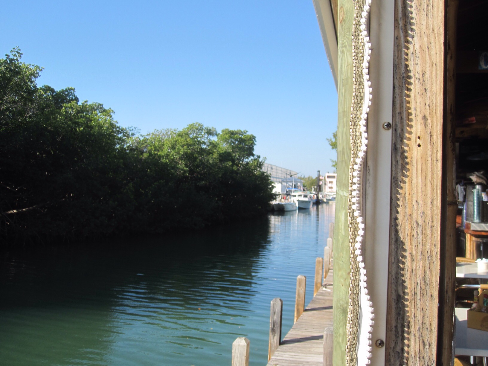 Once we were ready, we checked out (a laborious process that consisted of me walking toward the pub with the keys, only to be met by one of the hotel staff who took them from me before I could even get in the door). Then, we carefully got ourselves across the road (a challenge nearly every time we have to do it since traffic lights on the Keys are few and far between, literally) and rode on down to the Island Grill. It turned out to be just below our first bridge of the day, so we would have to ride backwards when we left. It looked like the place was totally empty when we got there, but it filled up quickly while we were eating. Since Henry had already eaten, he just had a glass of orange juice while I ate a yummy plate of corned beef hash and eggs and Angie a tasty vegetarian eggs Benedict.