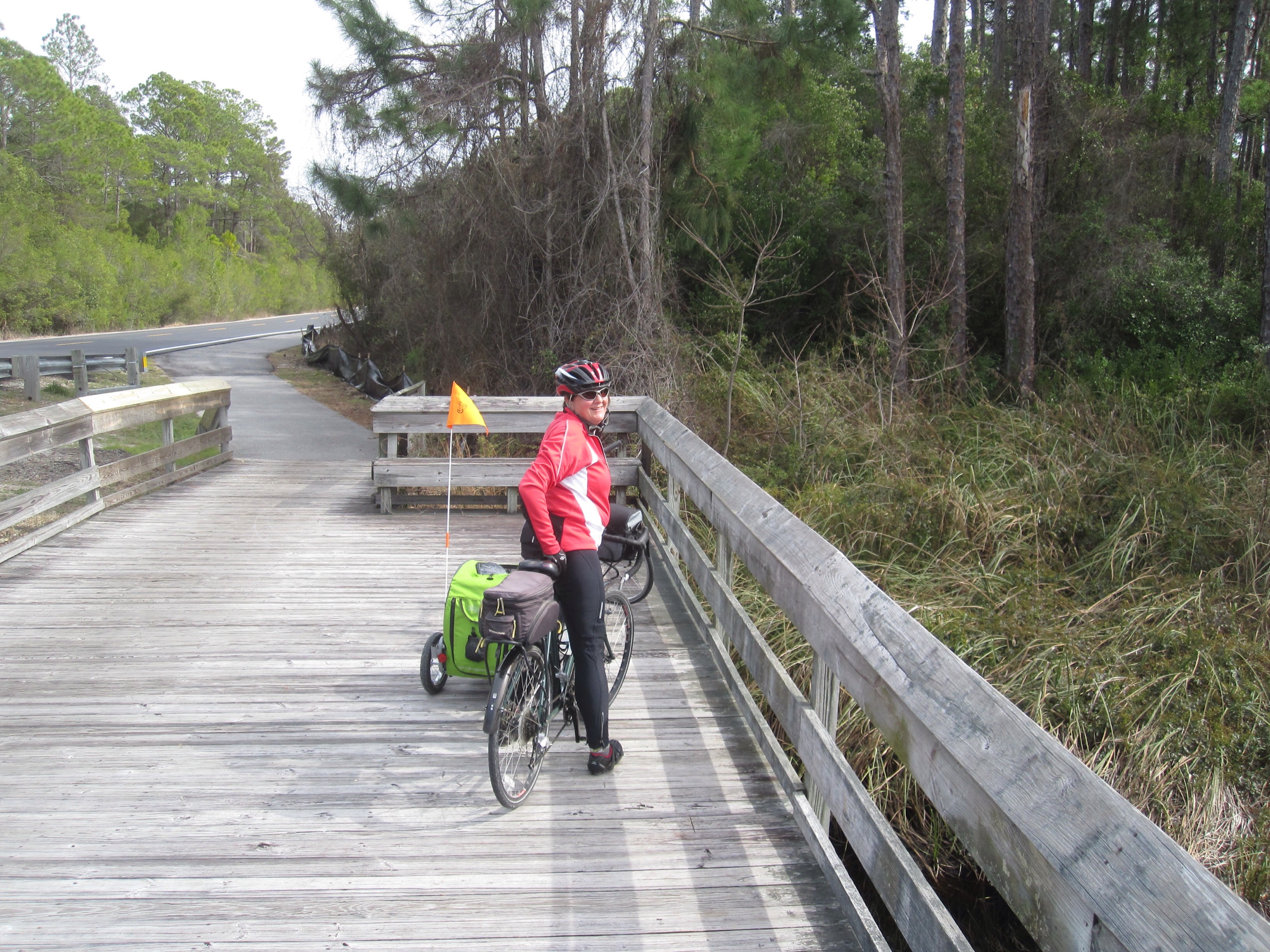 We rode about 8 miles along the trail. There were some Gulf views and lots of little towns and developments. The paved surface was smooth, but the trail was close to route 30A, which is quite busy, so it was not a quiet ride. We also wished that there were a few more places to pull out from the trail, though there are definitely more eating establishments being built. We noticed several places to rent bicycles, each with dozens of bikes on offer. I can’t imagine what the trail would be like if all those bikes were in use!