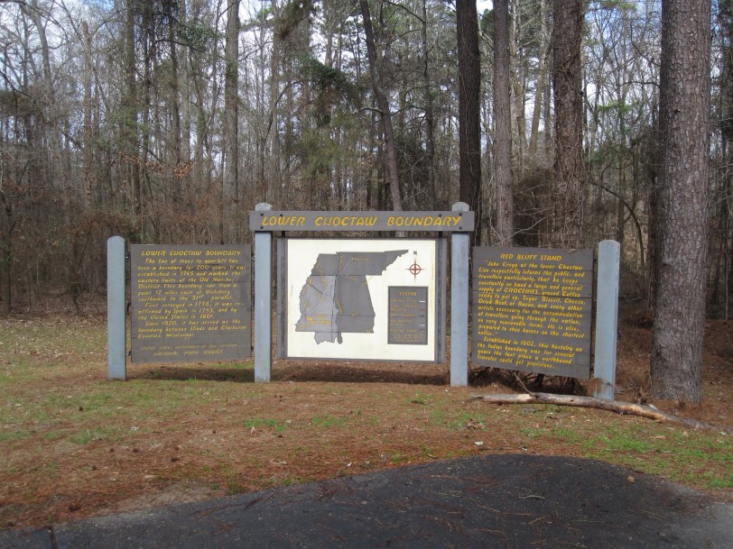 We stopped on the return trip at the Lower Choctaw Boundary. As the sign indicates, this was the last place northbound travelers could get provisions for the journey. Considering that this is about mile 60 of 444, that is pretty intense. I’m looking forward to seeing some of the Natchez Trace visitor centers in order to learn more about how they accomplished this. Did they really carry enough for that long of a journey? Did they shoot squirrels? How far did they travel in a day? I’ll try to report on what I can find out when we get there…