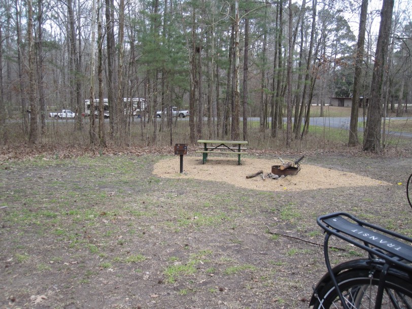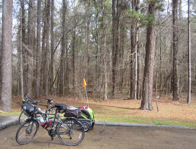 I have concluded that it is much harder to get motivated for cycling when you are traveling by car. And when you have a resistant dog traveling with you. Nonetheless, we did ride our bikes on the Natchez Trace on Wednesday. We had spent a good night at Rocky Springs National Park Service campground (nice, and free) and did not have to vacate our site or be anywhere else in a hurry. So we decided to ride before breaking camp. After freeing the bikes and Rebbe’s trailer from the rack and the chaos of the car, respectively, I gave the bikes a little TLC (lube, air, and some alcohol for disc brake rotors) and we were off. It was warm! (Remember this for later.) A pair of turkey vultures flew right over us shortly into the ride. They are huge and actually do look a lot like wild turkeys when they are on the ground. I told Rebbe to put his head in the trailer, though he was probably safe since they eat carrion almost exclusively. He was quiet after that for about 5 minutes–probably the longest stretch of the entire ride. While we have tried to encourage him to love cycling as much as we do, we have sadly come to the conclusion that there is not much joy in cycling for the little guy. Advice: get your dog a basket or trailer and use it when s/he is a puppy. I wish we had.