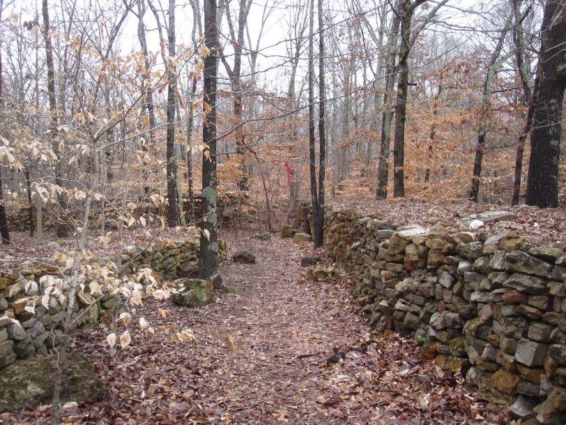 The two guides with whom we interacted (one sold us the tickets and was giving a group tour as we left and the other actually led our 3-person tour) both also provided suggestions for our last leg on the Natchez Trace. Our guide told us about a “wall” that was not far from Florence on the Trace. We weren’t quite clear on what he meant, but I didn’t remember to look it up until we were back on the Trace. We had passed it by about 2 miles, but as with Elvis, we decided to go back. We found the Wichahpi Commemorative Stone Wall and parked nearby. We were greeted by builder Tom Hendrix and his two aging pit bulls (Rebbe stayed in the car). Mr. Hendrix sent his other visitors to walk the wall and took about 15 minutes to tell us the story of his great-great-grandmother and the wall he has built to honor her. Long story short, she was removed to Oklahoma during the Trail of Tears, spent one winter there, and walked back to Alabama.