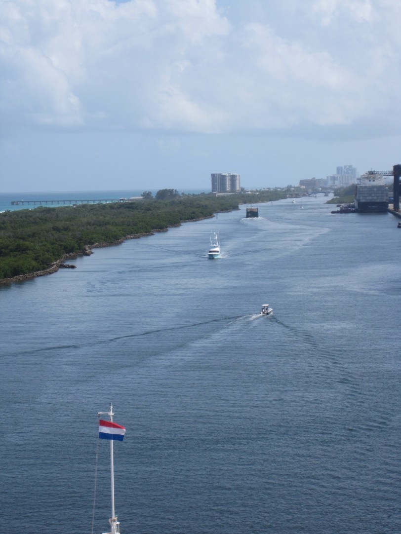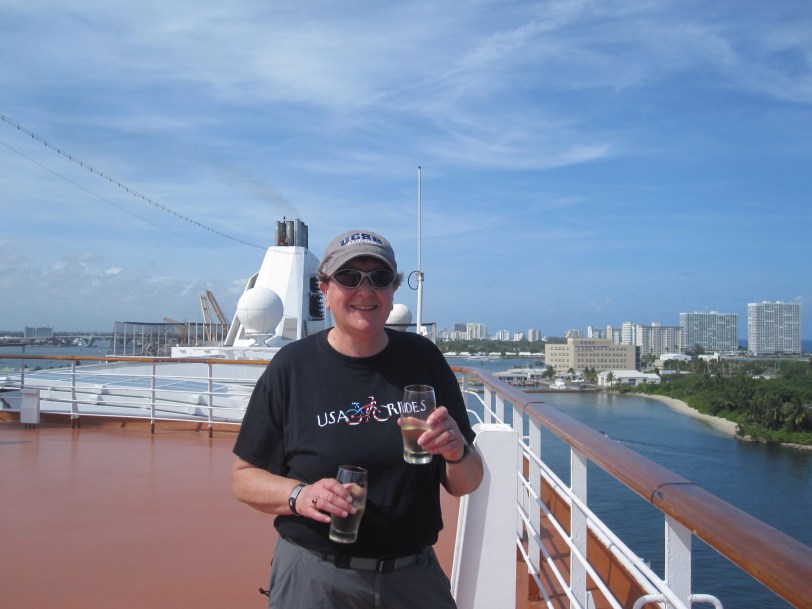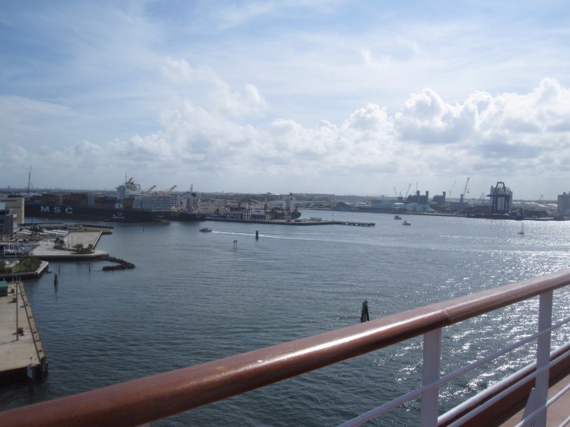 The first time you leave port on a new cruise is kind of special. Now, my first cruise, we left Quebec City on a miserable, wet, chilly day. Angie had her arm in a huge sling following her shoulder surgery and we couldn’t enjoy the sail away, as it’s known, from out on the deck. Today was much better. Of course, this time we were sailing out of Port Everglades in early April, so the weather was much better than Quebec even in May. We opened one of the bottles of prosecco we brought on board with us (you’re permitted to bring on two bottles of wine or champagne) and, lacking champagne flutes, poured ourselves a drink in the drinking glasses that were provided and headed up top to view the sail away from the deck.