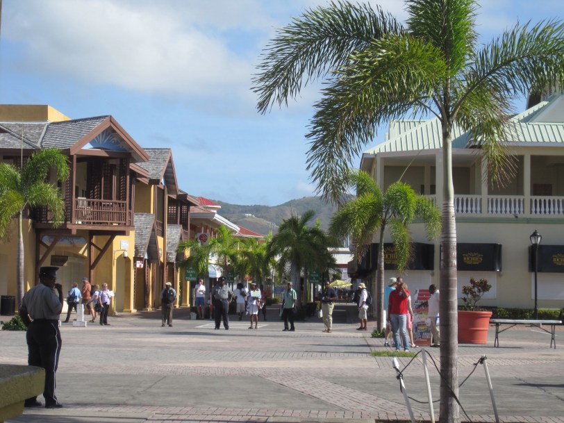 The night before we arrived in St. Kitts, I was a little confused about the meeting time for the tour. Not having Internet access, I could not easily check time zone information. I went to the library and learned that Aruba is on Atlantic time, which is the same as Eastern time during the “daylight savings” portion of the year. We reasoned that St. Kitts might be the same, but decided to get off the ship early regardless. It turned out my conjecture was correct and we had some time to kill in the port area before our tour, but that was fine.