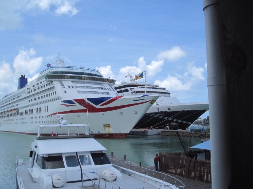 When we left the museum, we thought we might do a bit more exploring. I had read in the guide book pages Angie had brought with us that there was a shopping area that was slightly less crazy than the main drag, called Redcliffe Quay, and we managed to find our way to that. In fact the guide book (Fodor’s) said it’s the most appealing part of St. John’s. It was quite quaint but we didn’t see much that made us want to hang around. We started making our way back to the ship via the obnoxious street full of hawkers (Heritage Quay), which was not fun and in fact rather annoying, but then we decided to not go right back after all and to head back over to Redcliffe Quay, where we’d seen a bar/restaurant that offered free WiFi (for an hour anyway). We had a lovely spot up on a balcony with a view of the two cruise ships currently in the port (one ours and another that was P&O, the English line) and we enjoyed a snack (tadziki and pita) and a drink while endeavoring to get some blogs up.