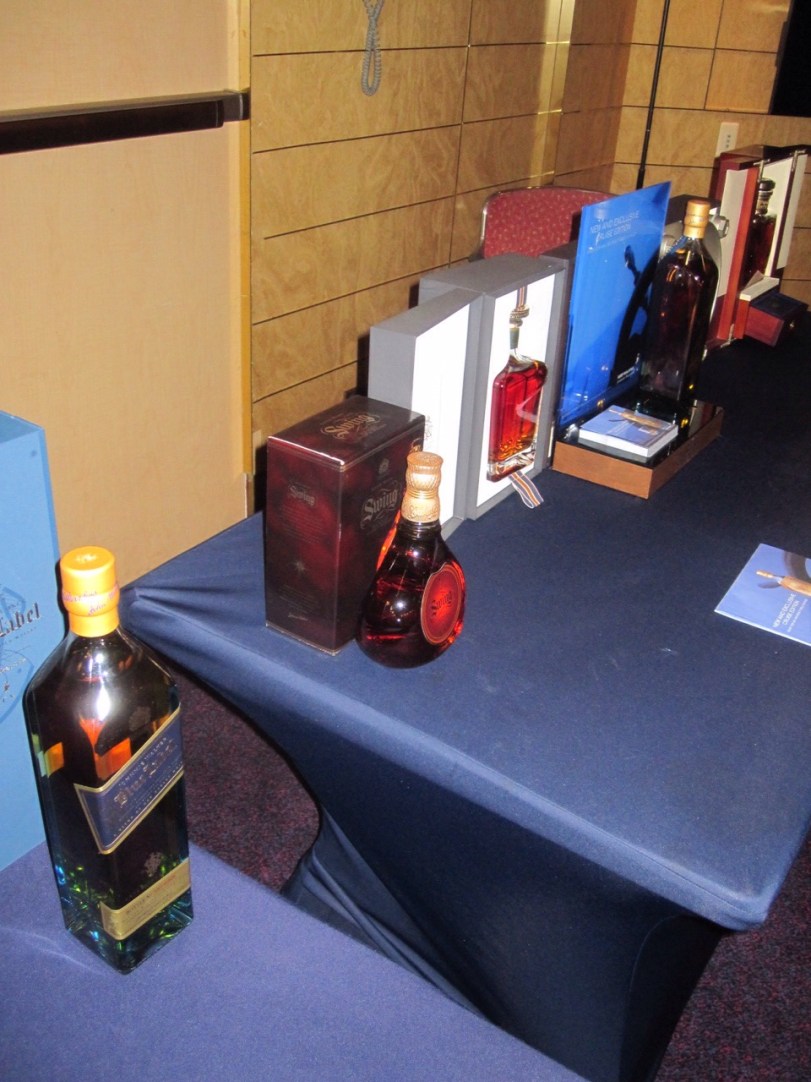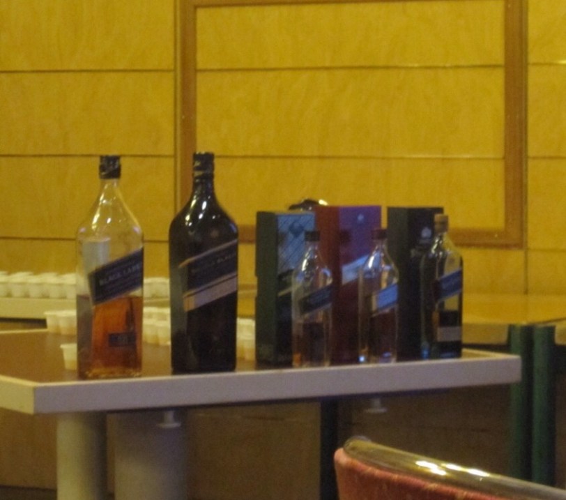 Our next event of the day also involved alcohol. The ship was presenting a seminar and tasting around the whiskies of Johnnie Walker. It was pretty informative as we learned that Johnnie Walker had owned a grocery store. He got his start because all grocers in Scotland sold local single malt whiskies but he did not like how inconsistent they were, so he started making and selling a blended whiskey. Things grew from there and his sons got involved and then his grandsons. We also learned that Walker was a canny salesman who saw sailors as a good market, so he made his bottles square so they could be packed better. The company also make one called Swing that comes in a bottle that wobbles so it can’t fall over on board a ship. The company now sells about 10 different versions of varying quality and presentation, including a $3,600 version that comes in a handmade wooden box with a decanter tip that can replace the screw top once it’s opened! We didn’t get to try all the varieties but we were treated to Black, which is my go-to scotch, the Double Black (peaty, not my fave), the Platinum, which was very smooth, and a couple of the Explorer editions including the $159-a-bottle Royal Route, which Angie really liked. We did not get to sample the John Walker, the one that comes in the presentation box!