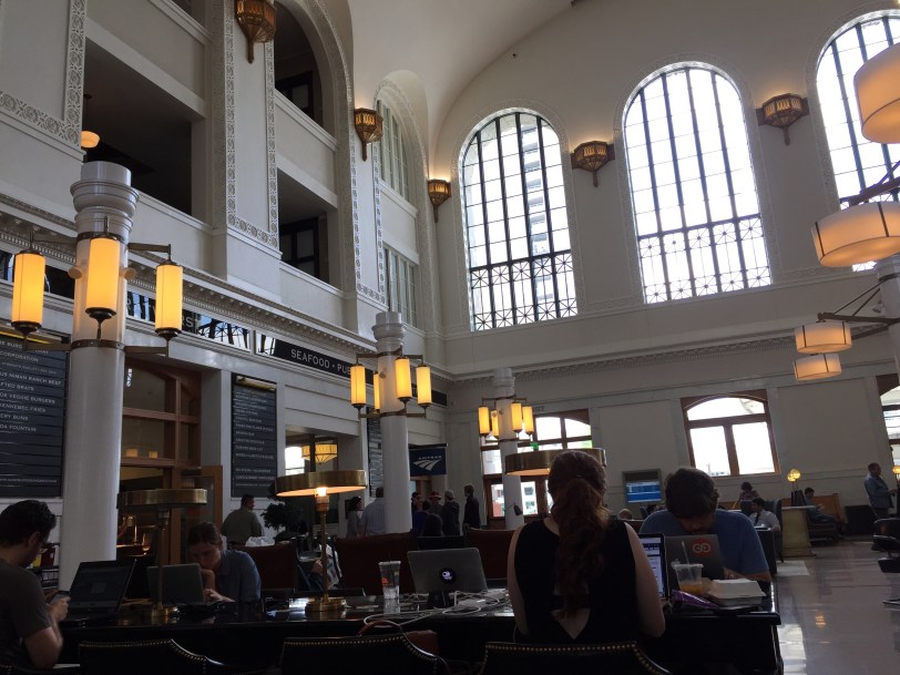 To start the evening, we planned to meet Maureen’s niece Hannah for Happy Hour. Since she lives in Boulder and we live in Lakewood, we arranged to meet at Denver’s Union Station, where our transit options intersect. Union Station now serves as a bus, light rail, and Amtrak terminal and reopened shortly before we left last summer. Thus, this was our first opportunity to see the revamped station. We parked at a station on the West Rail line and rode the light rail in. We were able to navigate buying tickets and finding the platform, but both here and at Union Station we found the signage to be less than ample. Once at the Union Station light rail stop, there is a short walk to the station.