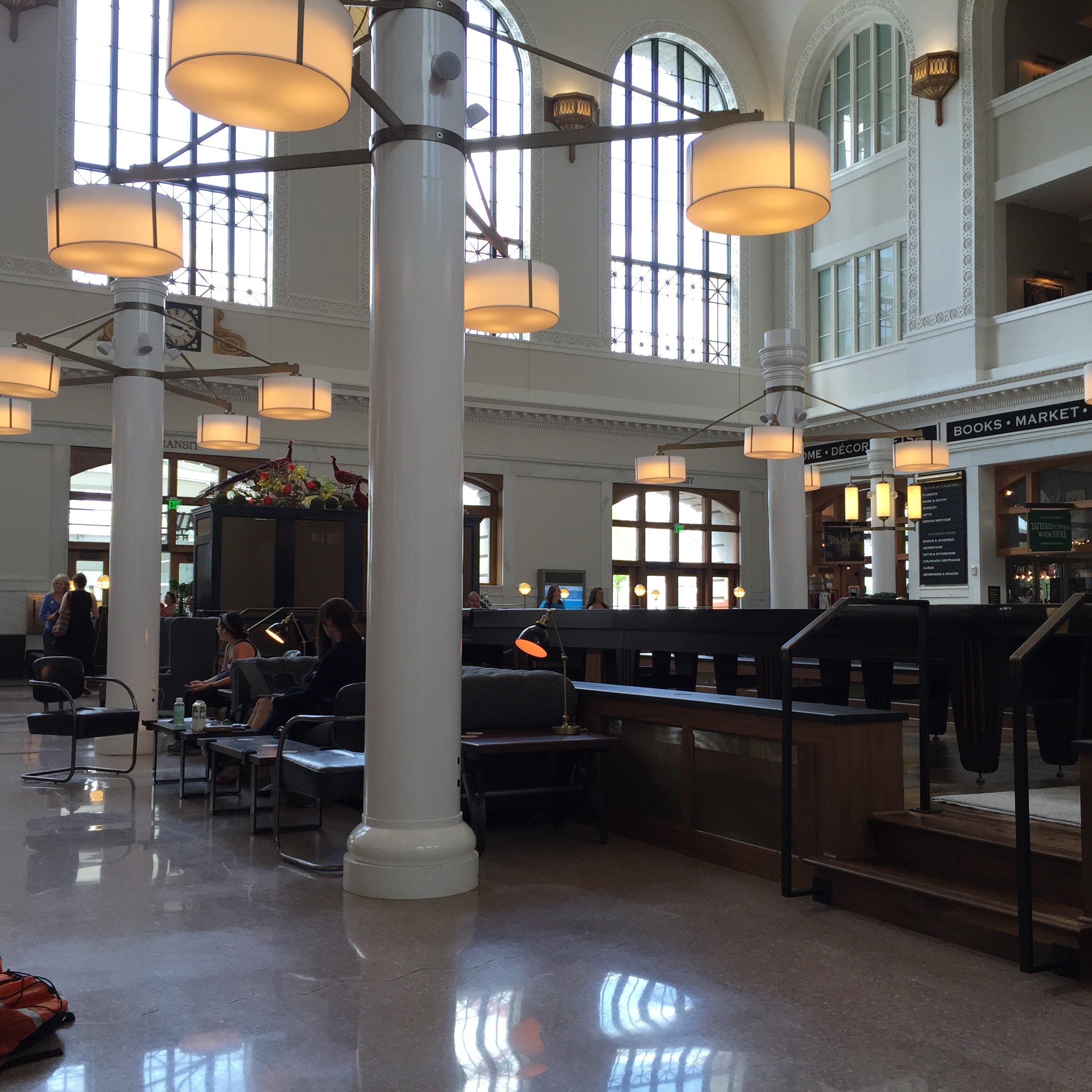 To start the evening, we planned to meet Maureen’s niece Hannah for Happy Hour. Since she lives in Boulder and we live in Lakewood, we arranged to meet at Denver’s Union Station, where our transit options intersect. Union Station now serves as a bus, light rail, and Amtrak terminal and reopened shortly before we left last summer. Thus, this was our first opportunity to see the revamped station. We parked at a station on the West Rail line and rode the light rail in. We were able to navigate buying tickets and finding the platform, but both here and at Union Station we found the signage to be less than ample. Once at the Union Station light rail stop, there is a short walk to the station.