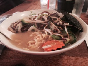 I paused on Tuesday to walk down to the sister restaurant of the place where we’d had the fantastic lunch on Sunday. Daikaya is a ramen bar. I was a bit concerned because the only non-pork dish they offered was vegetarian, but in the end I was not disappointed one bit. There were a ton of vegetables in my broth, including Brussels sprouts and wood ear mushrooms, and it was tasty and filling.