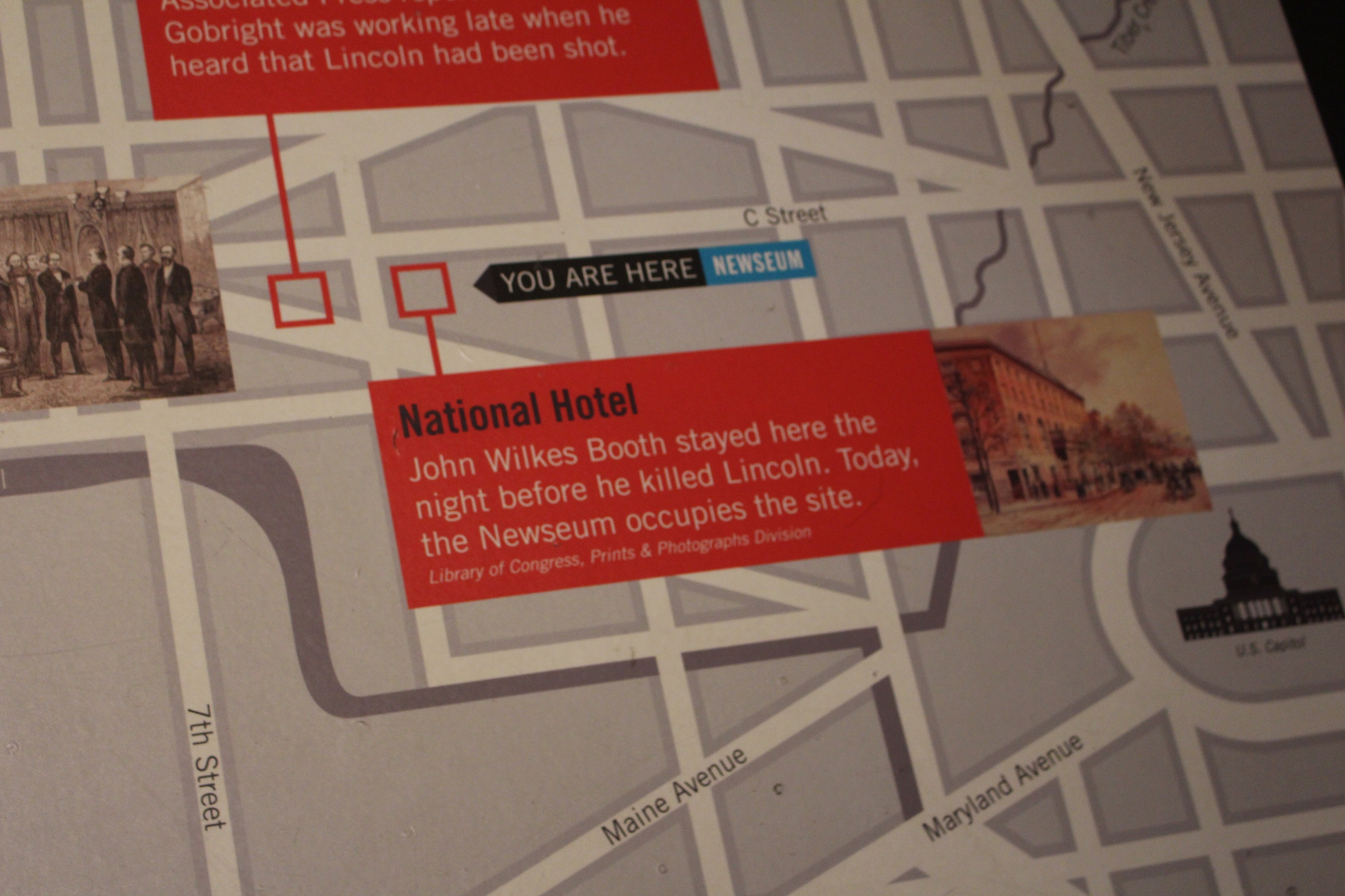 Lincoln’s assassination was one of the other exhibits I looked at back at the Newseum. It had some interesting details. There was a map on the floor showing some of the key locations in the tragedy. It turns out that Newseum, which is on Pennsylvania Avenue, is on the site of the hotel at which John Wilkes Booth had stayed before he shot Lincoln.
