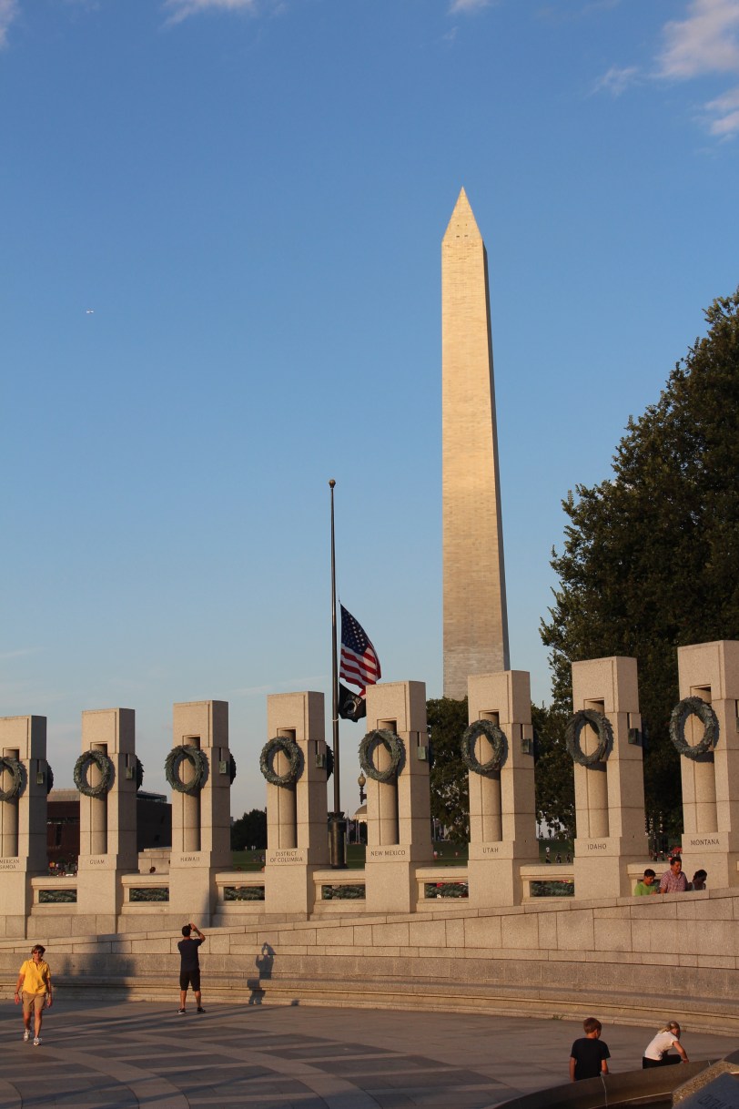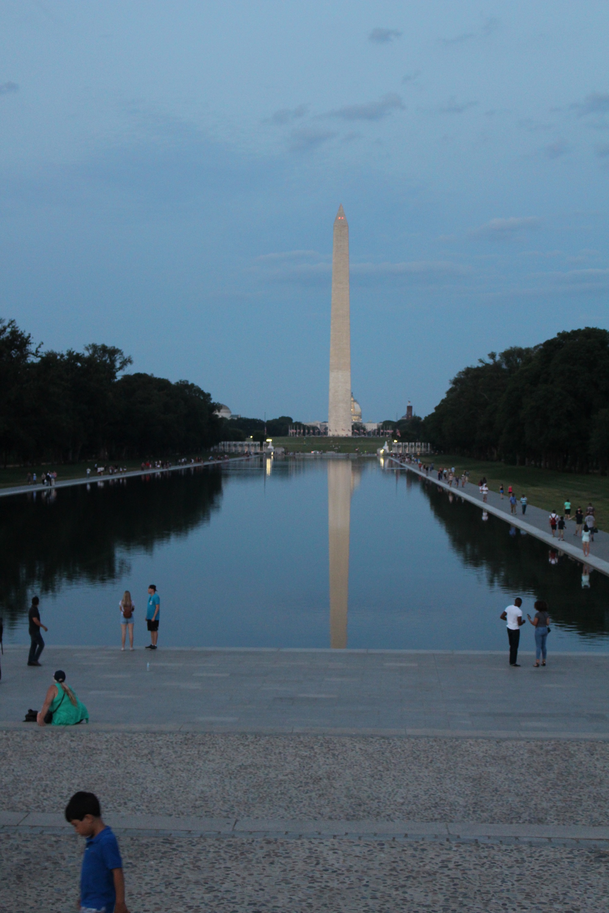 As I wrote, I spent a chunk of Wednesday back at Newseum, even having lunch in the cafeteria so I didn’t have to leave. They did salad by the pound which was satisfying but spendy. In the evening, we had an early dinner, and then Angie, Cece and I set off to walk too some of the monuments. There was no logical way to take the Metro to get there, so we had to walk both ways, which was pretty exhausting. We started out with the intention of seeing just the Martin Luther King and FDR memorials but also ended up checking out the World War II and Korean War memorials too, as well as passing close to the Jefferson and Lincoln. It was a lot of walking on a hot evening. The MLK memorial was really impressive, as was the FDR, which I quickly realized I’d seen before. It was really crowded, so we didn’t stay long. Actually the entire mall area was pretty busy, probably because it was a nice night.