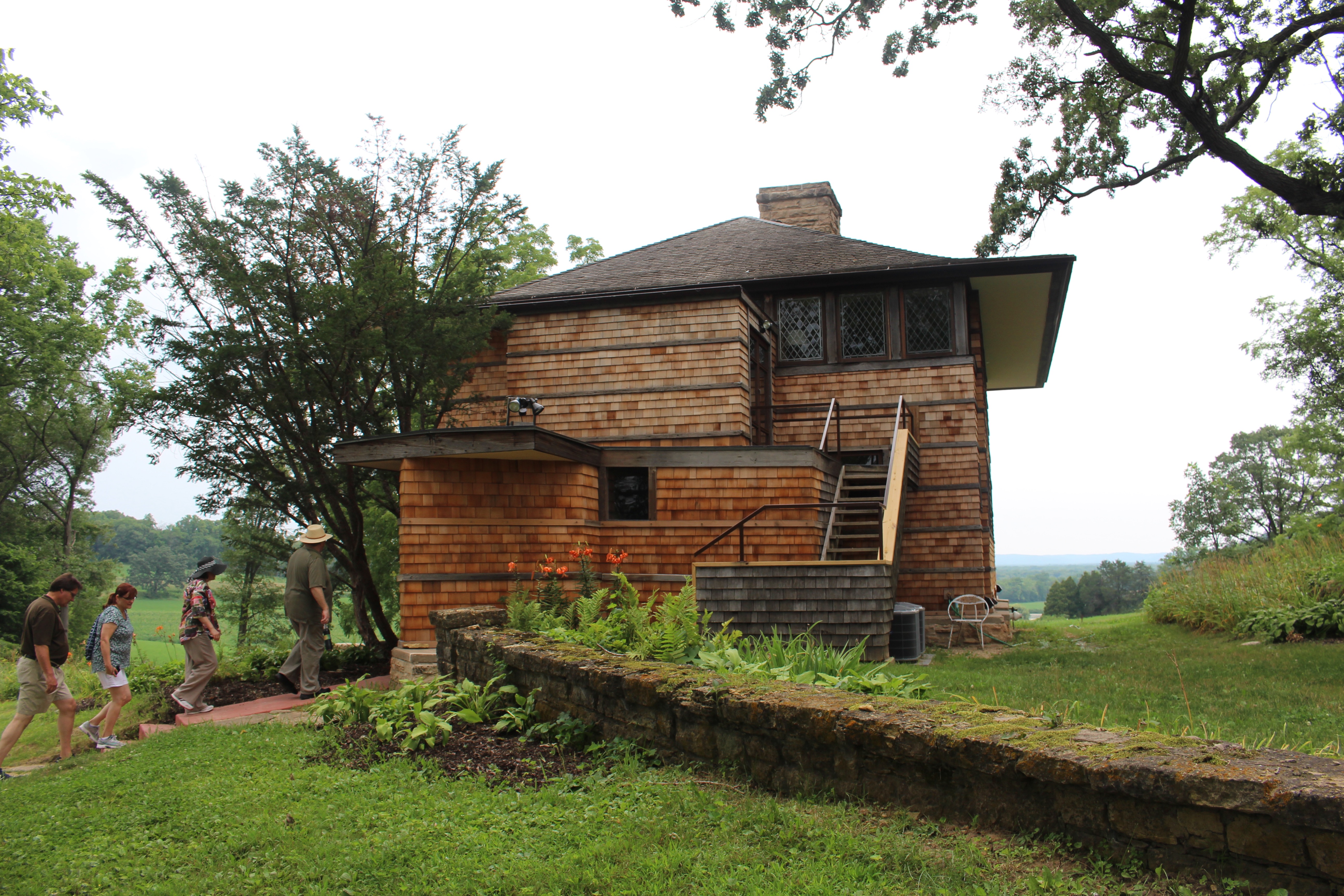 A bus took us from the visitors center up to the first stop, but after that, we were traveling by foot, and it wasn’t flat! The pace was pretty mellow for us, but a couple of people apparently hadn’t read the description fully and struggled with the walking, though it wasn’t unbearably hot. And before I get into the day, one of my usual digressions. What, you may wonder, did we do with Rebbe while we were taking the four-hour tour? Well, my super resourceful wife had located a doggy day care facility in the town of Spring Green, which is close to Taliesin. Spring Green Pet Resort took our reservation a few weeks back too, and we dropped Rebbe there before heading off for our big day. The first stop on our route was the Hillside Home School.