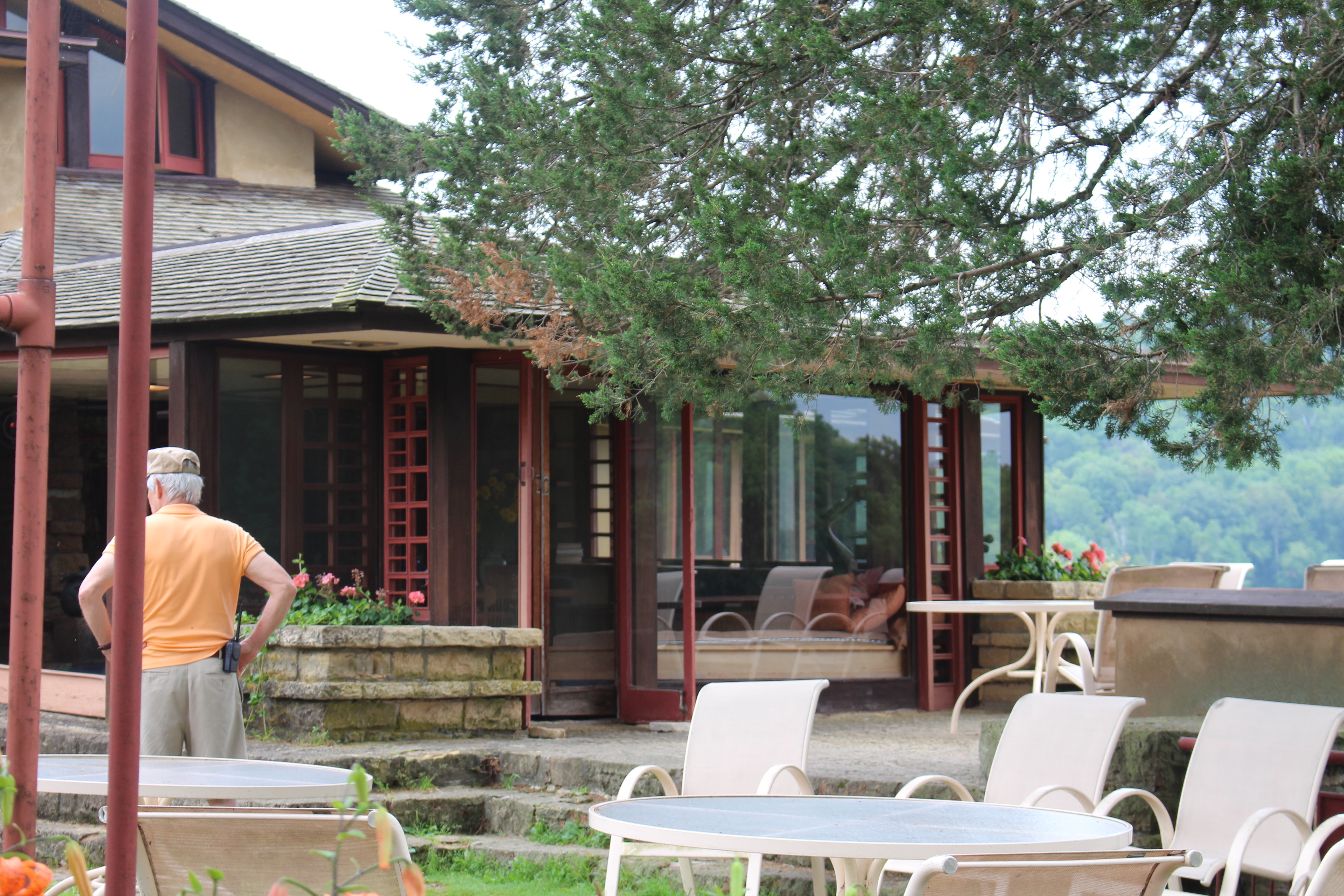 The power lines in the valley are underground, and there’s no commercial signage. Because we were on the high-end tour, we were treated to drinks and cookies when we arrived at the main house. The cookies came from the cafe at the visitor center and were delicious. For drinks we had a choice of lemonade, iced tea, coffee, and water. The main house, Wright saw as his lab, and his apprentices worked on it, so there is less consistency in features and design.