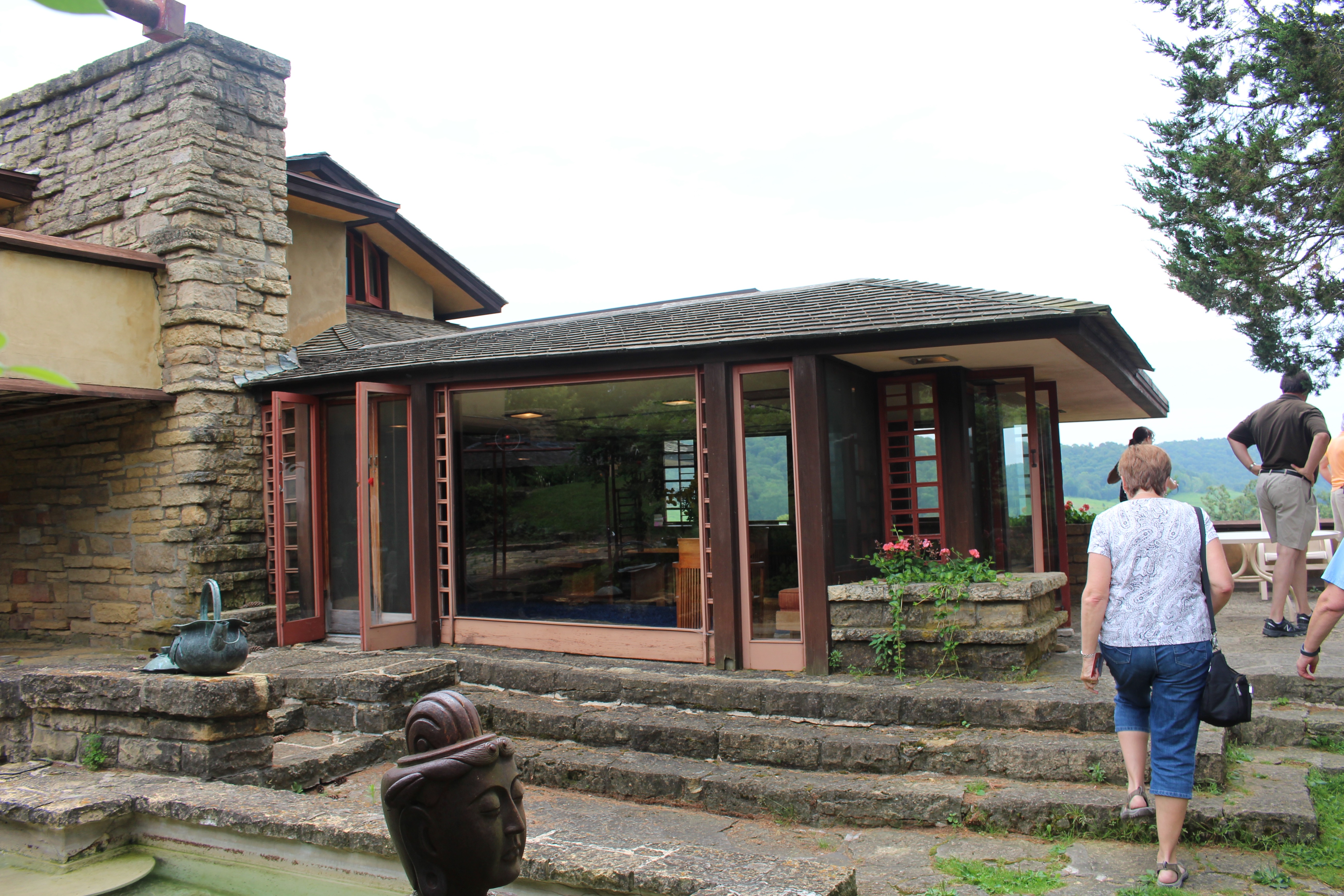 In 1914 a fire was set by a disgruntled/maniacal servant. He set the fire and killed Wright’s mistress and her children as they tried to escape. Others died of burns sustained in the fire. The second fire was in 1925, caused by an electrical problem. Wright was there and tried to save the property, but much of the house was destroyed along with many of his valuable pieces of Asian art that he’d collected while in Japan on the Imperial Hotel project. The House was expanded over time. There are four courtyards, all with a continuous line of sight.