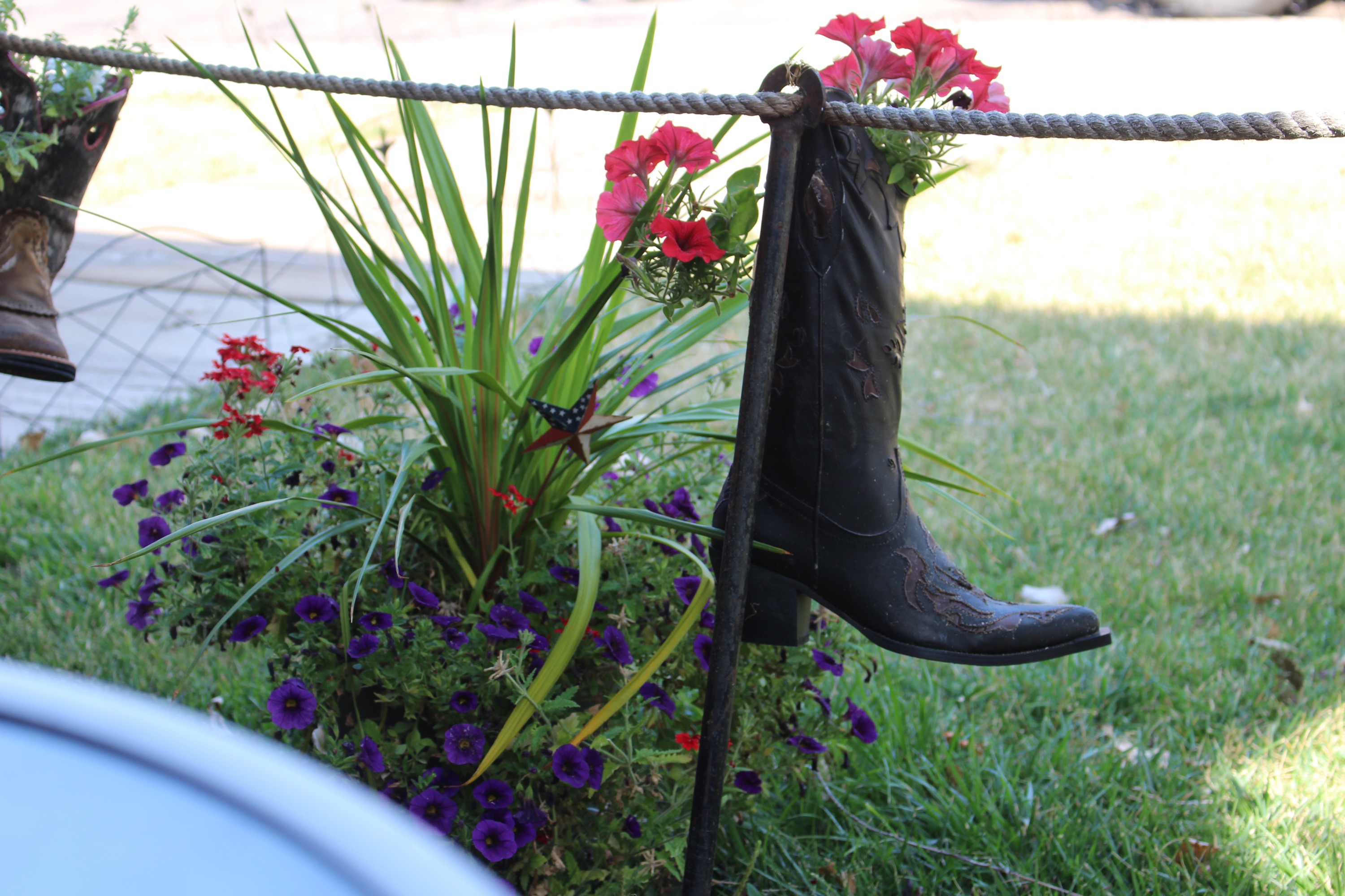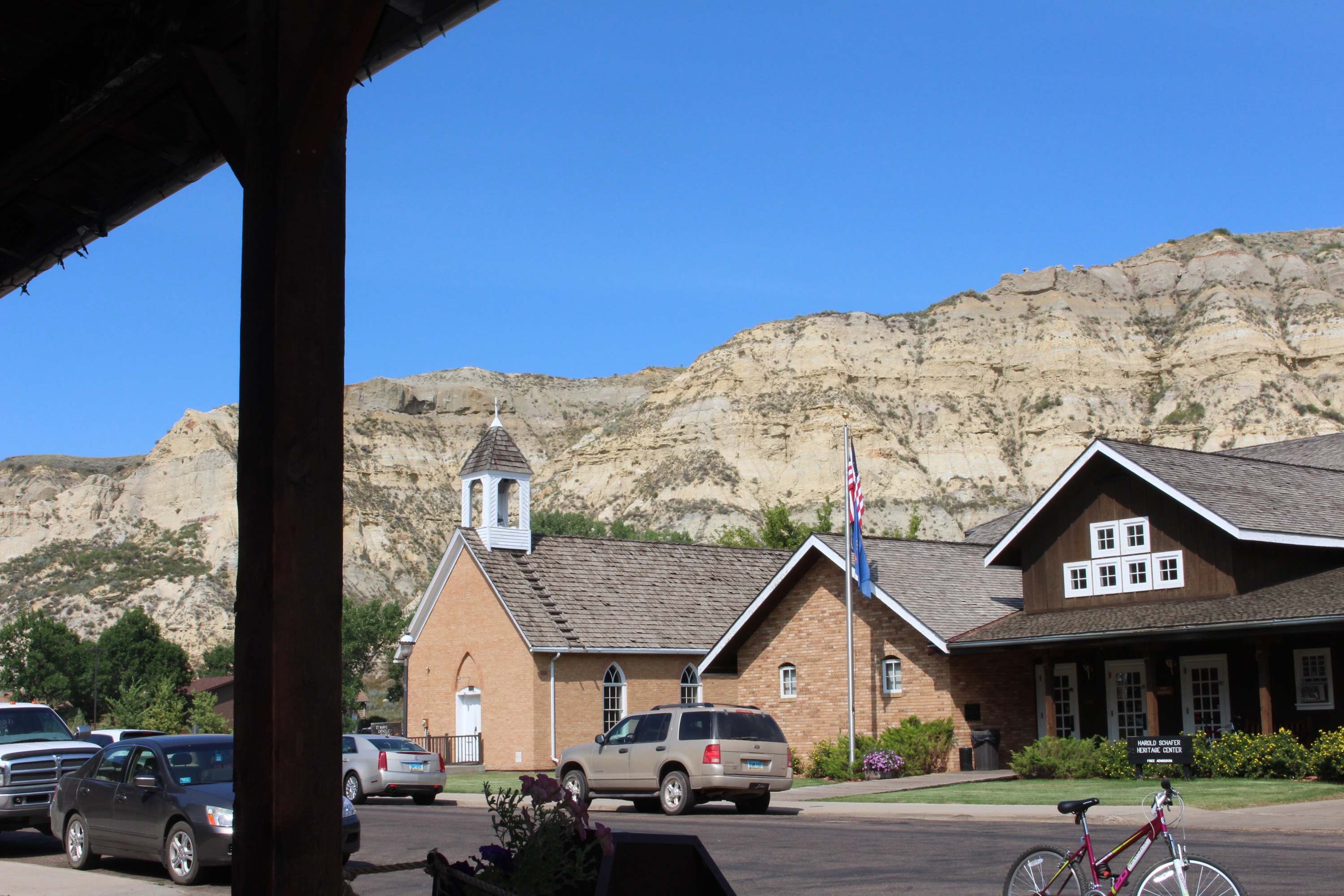 After a simple lunch from the cooler, we decided to take a drive rather than sit at the hot and busy campground. We first went to the main park Visitor Center. As is our (necessary) custom when we travel with Rebbe, we took turns. Maureen watched the park video and reported that it was “OK,” so I spent my time looking at the Teddy Roosevelt exhibits and the store. They also had a (taxidermically) stuffed snowy owl, which was quite cool. Next we stopped in the small gateway town of Medora, built by the Marquis de Morès, who came here in Roosevelt’s time to ranch and build a meat processing plant, and named for his wife. I had glimpsed an ice cream store on the way in, so that was our goal. We had first to find a parking spot. On a Friday, in tourist season, this took a few minutes. Maureen had noticed that the local bike shop, Dakota Cyclery, had some sort of event going on, so we stopped there to investigate and get an ice cream recommendation. The event turned out to be packet pickup for the Maah De Heey trail races (100/75/50/25 mile options). The ice cream verdict was “they’re all about the same.” This turned out to be quite true, as I dropped in to both shops and found the same flavors, written using the same font. And the flavor selections were clearly designed for those about four decades younger than us (cotton candy ice cream, anyone?) We kept moving. Fortunately, we came across a coffee shop (Hidden Springs Java) with smoothies and blended coffee drinks. It was packed. Maureen astutely pointed out that this was where all the grown ups were. She stood in line for our adult treats while Rebbe and I waited outside (for quite some time). At least Medora had AT&T wireless signal, which was not detectable at our campsite. Suitably “treated,” we took our coffees and headed back into TRNP.