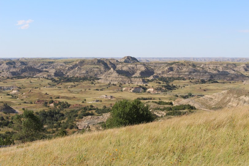 The Gas Buddy app had assured us that we could fuel up 75 miles out, so that was our next stop. Shortly thereafter, we crossed into the Mountain Time Zone (which we had not really thought about) meaning we’d reach our destination about an hour before we’d planned–ultimately a good thing. It was oddly comforting to be on Mountain time again. We reached Medora, ND–gateway to Theodore Roosevelt National Park–just before 11 am. We headed right to the campground after hearing it was already starting to fill up. Luckily, we were able to secure this lovely site.