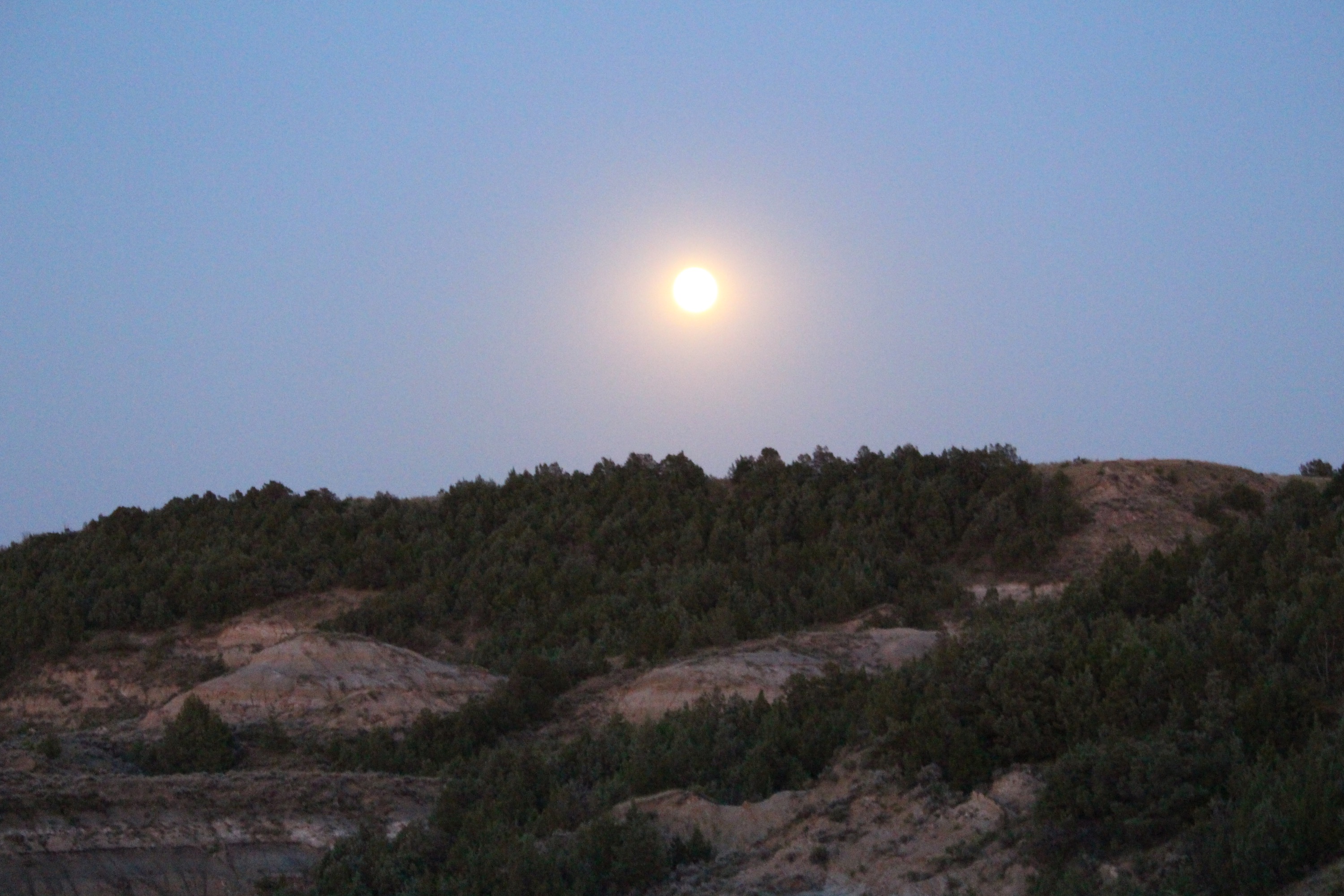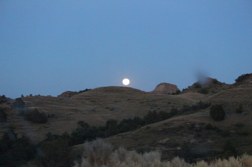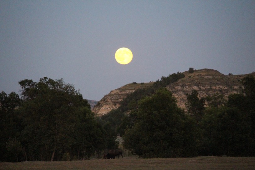 We returned to our campsite for dinner. Maureen had asked one of the Rangers where we should go to view the full moon, since we couldn’t join the ranger-led full moon hike (no dogs allowed). The Badlands Overlook was recommended. We headed that way around dusk. Here are some of our blue moon and bison photos: