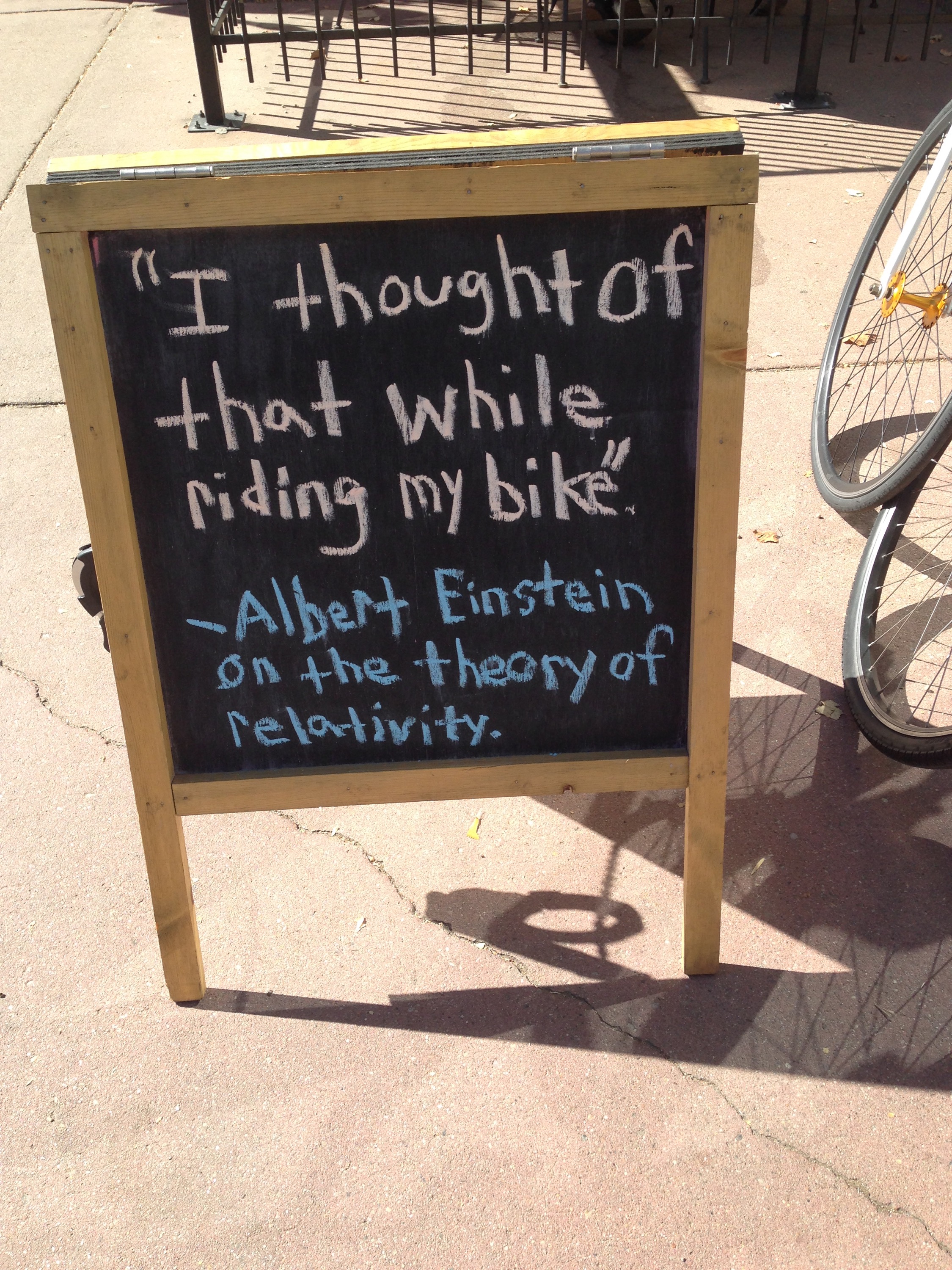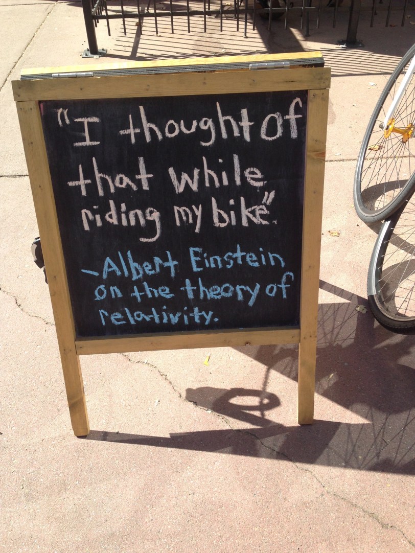 Shortly after we “moved” to Boulder, I had lunch with my friend Laurie on “The Hill.” For those of you who don’t know, The Hill is the residential and business area just above the University of Colorado. Not surprisingly, the ride to lunch was all uphill. We enjoyed a good lunch at The Corner and a great chat. Afterwards, Laurie showed me this sign that she had seen outside a nearby bike shop.