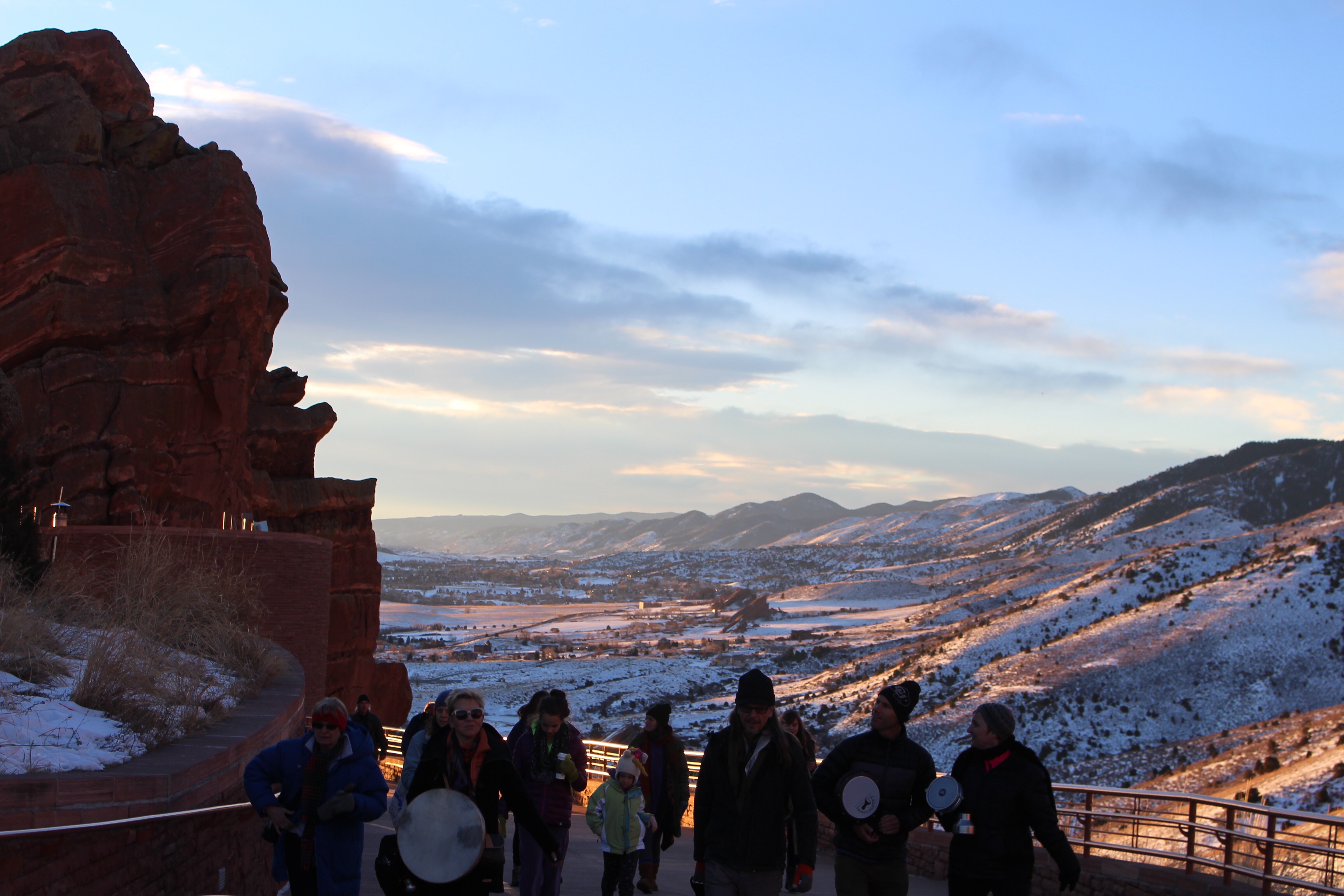 Since Maureen’s drums are somewhere in the storage unit (read: quite inaccessible), we borrowed a 5-gallon bucket and some wooden spoons from my brother, selected our warm clothing, and prepared for an early start. We met our friends at Red Rocks Park and Amphitheatre, a spectacular outdoor venue, while it was still dark at about 6:20 a.m. People were already drumming and drinking coffee, and there were a few didgeridoos, guitars, and maracas as well. We joined in and also managed to get some photos. The pre-sunrise was beautiful.