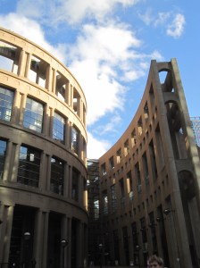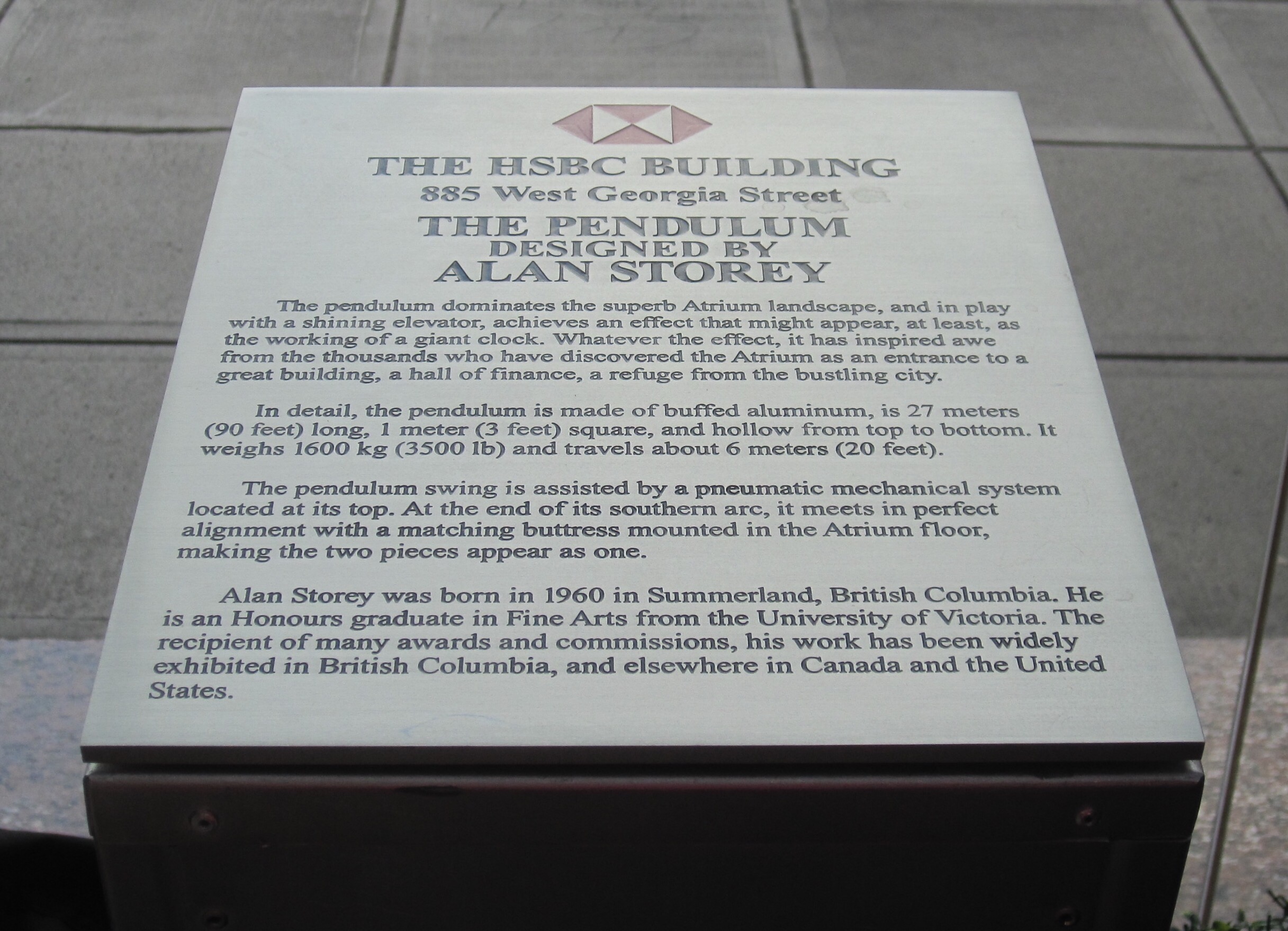 The pendulum is not an actual pendulum (it has power-assist), but rather a piece of art called Broken Column by Alan Storey. Twenty-seven meters is pretty big, so it is impressive.