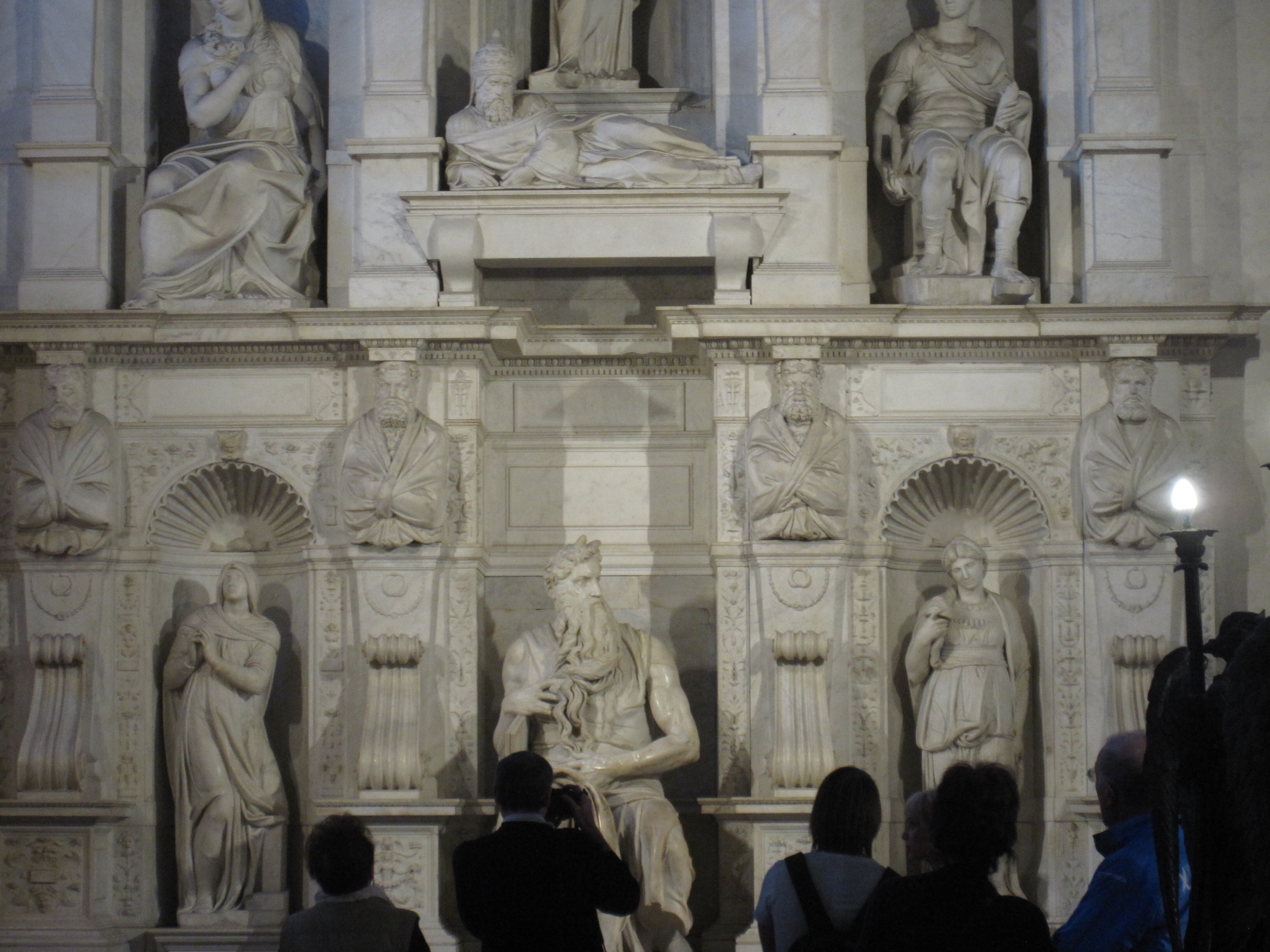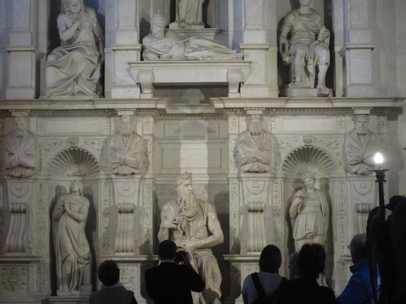 I enjoyed remembering some of the fantastic art we saw during our Gap Year, including Michelangelo’s David, Pietà, and Moses. Reading about his life in this exhibit, it was perhaps painfully clear that he was primarily (and with great genius) a sculptor, which solves some of the mystery of why the painting on the Sistine Chapel ceiling is not quite what one anticipates from a great artist. His commission for that project came from Pope Julius II (Michelangelo’s patron for many years), so he had little choice but to accept it. The contentious and eventually much-scaled-down project of the Tomb of Pope Julius II was one of Michelangelo’s great projects. I was happy to finally get to see it–including the Moses with horns statue–at St. Peter in Chains in Rome on my second visit there. Many of the models in this local exhibit were roughs for the original 40-figure tomb design. Interestingly, Pope Julius II is not buried in his tomb (before you ask, I don’t think anyone is), but lies in St. Peter’s Basilica with the rest of the popes.