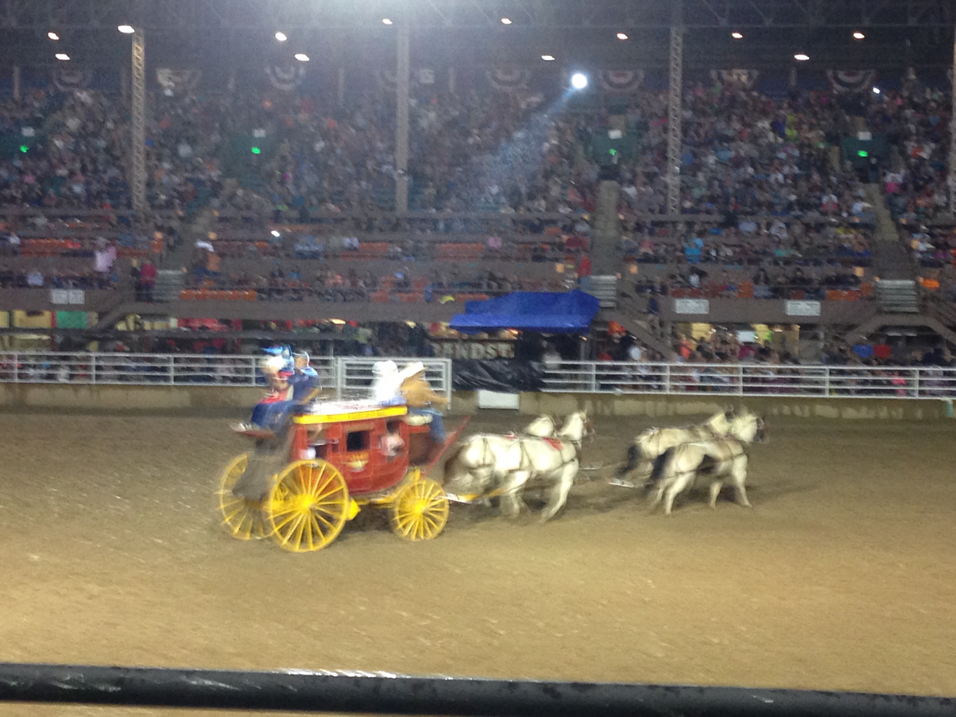 It started raining quite hard after a while (not in the forecast) but the show went on anyway. We did watch a few of the events. Things like bronc busting and bull riding are not really my cup of tea, since it seems pretty cruel, but for some reason, I do find things like calf roping kind of fascinating. We were on the same side as the scoreboard, so we were unable to see the scores. We left before all the different events were over, once the rain had stopped, and didn’t see any barrel racing, if there was any on tap that night. That’s definitely the event I like the best so it was a bit of a bummer. We did stay long enough to see Jake Jabs, a Colorado institution, and the founder of American Furniture Warehouse, parade through the arena in a stagecoach, along with a performance from the CSU-P Cheerleaders and dance team.