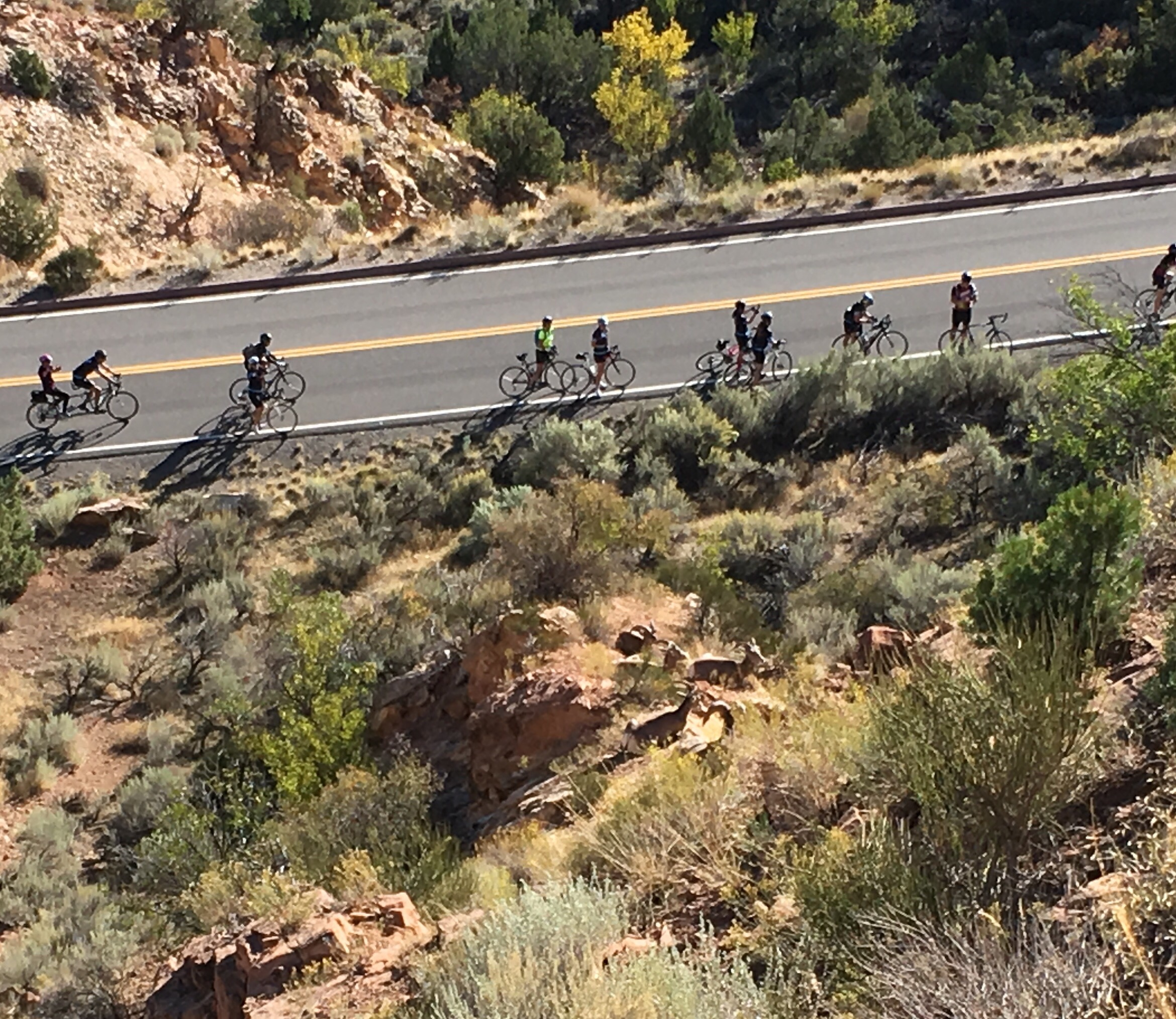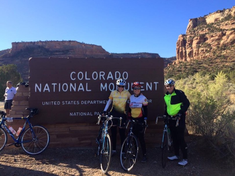 The morning was cool, but clear, a great day for a ride. Only a few of us were doing the shorter, 41-mile route. No matter which route one chose, the climbing started almost immediately. We had a short photo-op (and light check and clothing removal) stop when we entered the Colorado National Monument.