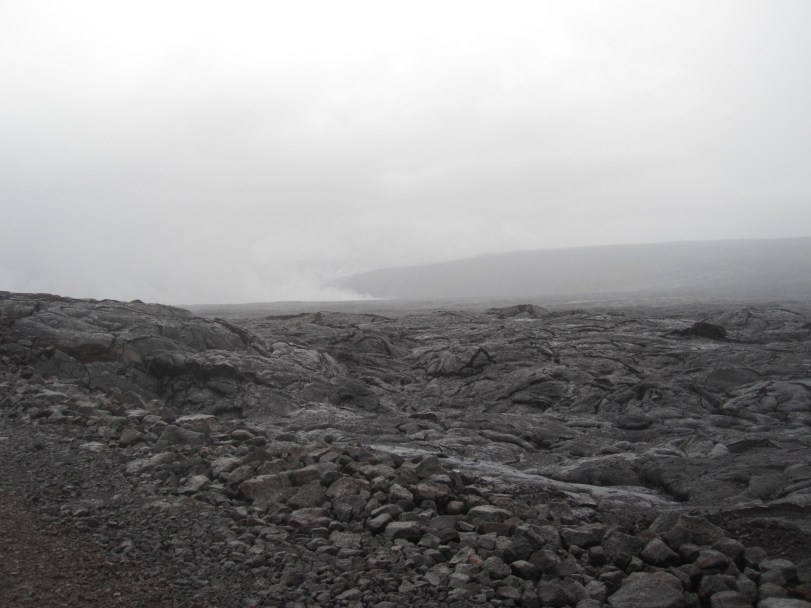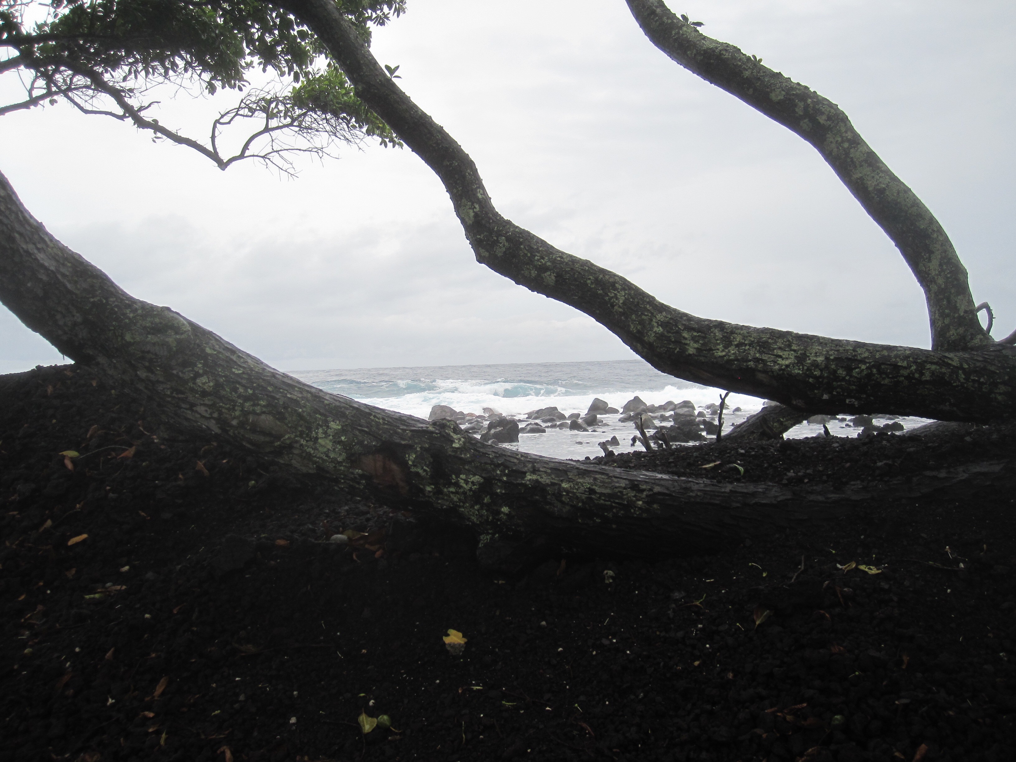 In my chat with the young man from CaΓ±on City, I had surmised that there was actually a beach that was reachable from the village, Kaimu Beach Park. It wasnβt clear if it was strictly legit, but since the rain had eased somewhat, I wandered over (circumnavigating a massive puddle) and made my way to the path I discovered there. There were a lot of things that looked like shrines, and I tried to be respectful of them, rather than taking a ton of pictures. While I didnβt get to have the great experience of watching the lava fall, steaming, into the ocean, I did get to walk along the path where the lava had flowed to destroy the original beach and see some great lava formations. According to Wikipedia, people planted sprouted coconut to help restore the beach, and once again there is a bit of a black sand beach, although apparently the water is very dangerous there.