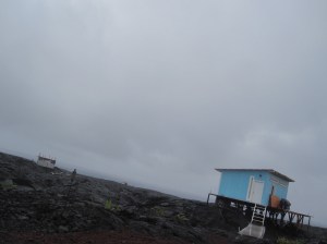 We had been told that there were bike rental tents at the end of the road, so we were surprised to arrive at what we thought was the end of the road (with warnings not to proceed) to find nothing. We drove into town and almost gave up, but I was so dispirited that we decided to go back to the “end of the road,” just to be sure. As we sat there contemplating what to do next, a man drove up in an aged Toyota pickup and told us that the road continued for another half mile and we could drive it easily. We weren’t totally convinced, but after watching him drive on what had appeared to be a bike path to avoid a huge puddle, we decided to go for it. There was one more sizable puddle to avoid and then the road turned back from dirt to pavement! And indeed, when we reached the real end of the road, there were several tents full of bikes (yes, full of bikes–it was still raining quite hard!). I braved the rain to go talk to the young man at the tent closest to the end of the road and noticed (oh thank goodness!) that there were porta-loos across the road. I got the info–ride 4 miles, park the bike anywhere, walk about 1/4 mile across old lava to see the new lava flowing into the ocean–and used the “facilities” before heading back to the van to chat with Maureen. She wasn’t sold on the prospect of a wet mountain bike ride and taking a chance on getting the van back through the puddles after another couple hours’ rain, so we decided that I would ride and she would head back into Kalapana (see her story below) until I finished, leaving me to hike the 1/2 mile out if the puddles got too deep.