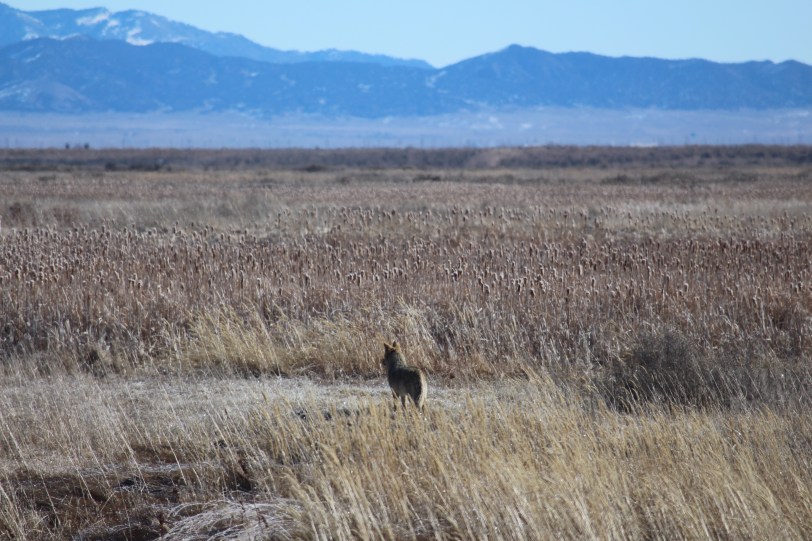 After the experience with the flying sedge of cranes, when many of them had landed in their munching spots, we headed to Alamosa. There we popped into The Roast for coffee and a pastry. Good coffee and great atmosphere. I think I’d try the real breakfast rather than a pastry if I went back. Next up was the Alamosa National Wildlife Refuge. Based on what we’d read in brochures and on TripAdvisor, we weren’t expecting much. We opted not to take the four-mile nature hike at the visitor center, as it was still only about 20 degrees, and made our way onto the nearby driving loop instead. A few yards in, we had our first spotting–a coyote! It walked across the road, and seemed to look back at us.
