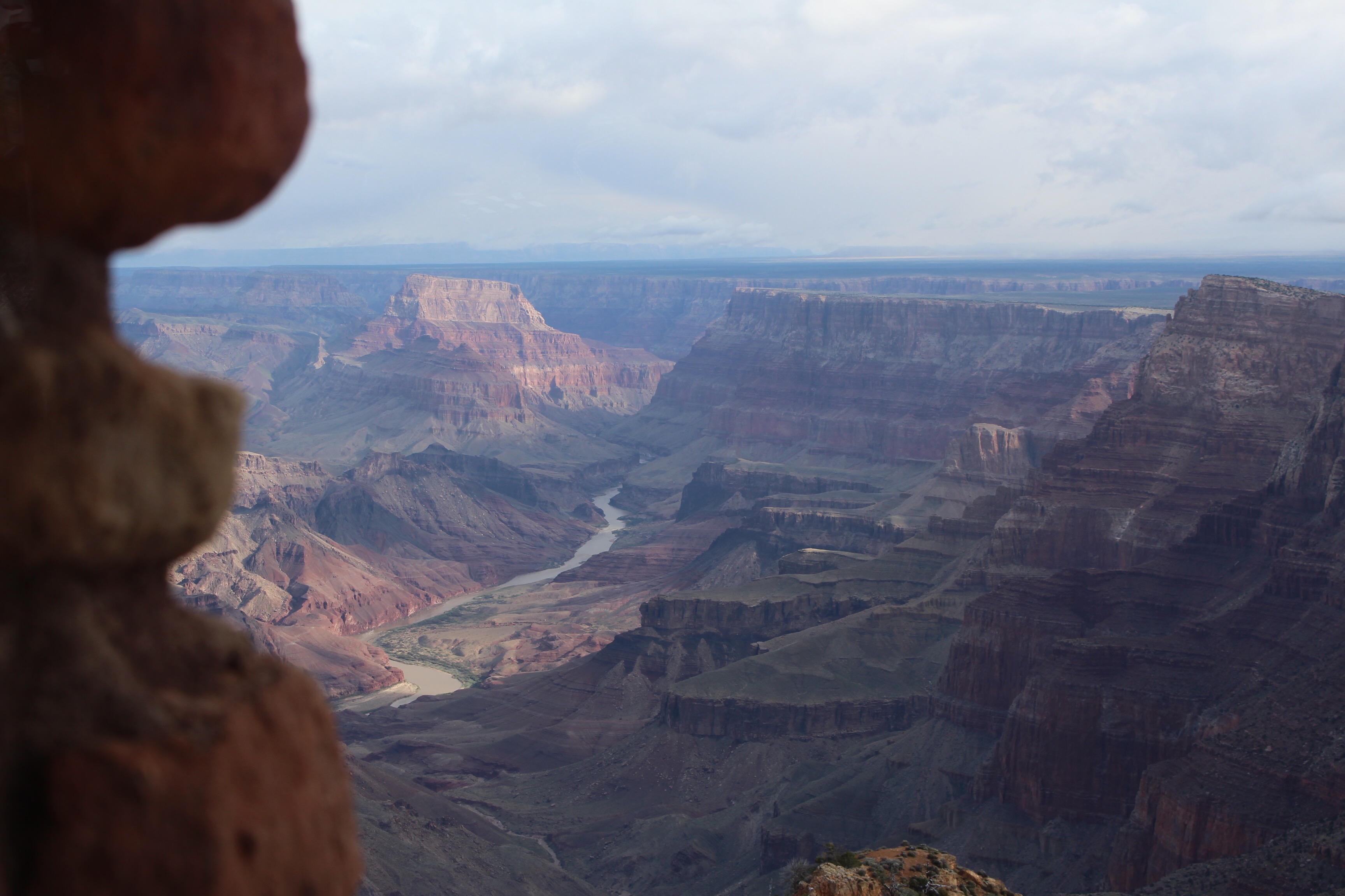 The weather also meant we had the road mostly to ourselves–a rare treat in a crowded National Park! We could see that the Canyon was obscured by low clouds, so we did not stop at the first several pullouts. We did stop at Moran Point and Lipan Point and were rewarded with some beautiful interplay of light and canyon.