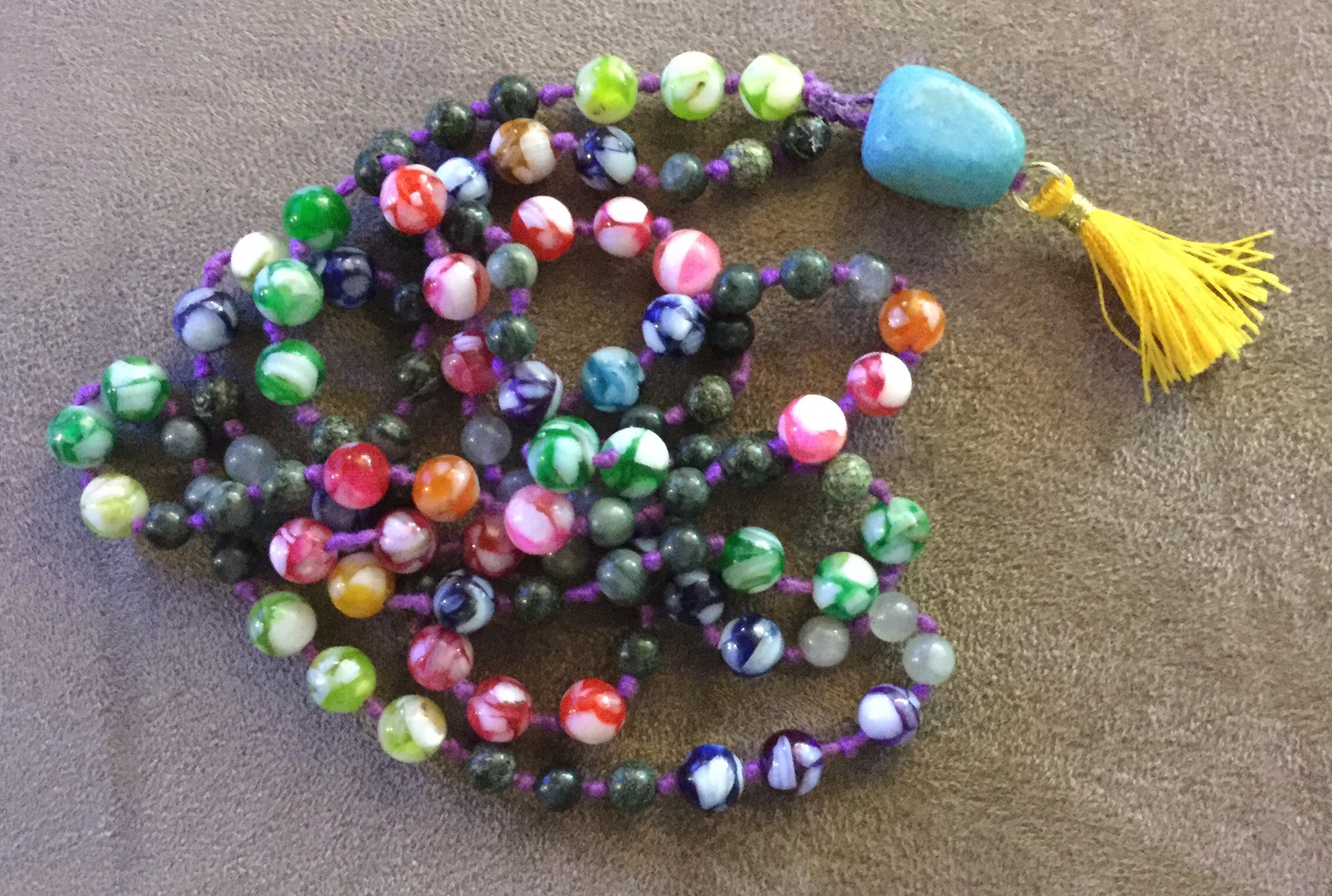 I was slow. My intention, however, was about acceptance, so I just accepted my slowness. Finally, all the beads were knotted in. Jessica then helped each person add a “guru bead” (to honor one’s teachers) and a tassel and form the 108 beads into a closed loop. She made this a great class and I think my mala came out quite well.