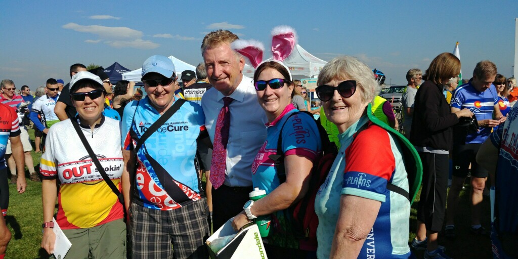 We spent Thursday night at a friend’s house in Denver, so it was a pretty easy drive to Kersey Friday morning. Packet pickup did not open until 9 a.m. (!) and we arrived at approximately 8:55. One of the first things we learned was that the parking field was filled with goatheads. In other words, do not put your bike tires on the field under any circumstances. This is one of the hazards of a late season ride, as goatheads are not really a problem in spring and most of summer. When we reached the check-in tent, there were huge lines. Sigh. Unfortunately, there were no labels on the lines except at the very front, on the tent. Even more unfortunately, the alphabet was divided awkwardly, and the line containing P (I think it had M-U!) was extremely long and slow. Maureen finished in the G line long before I reached the front. We did meet some fellow riders in line and got our photo taken with Denver weatherman Mike Nelson while we waited.