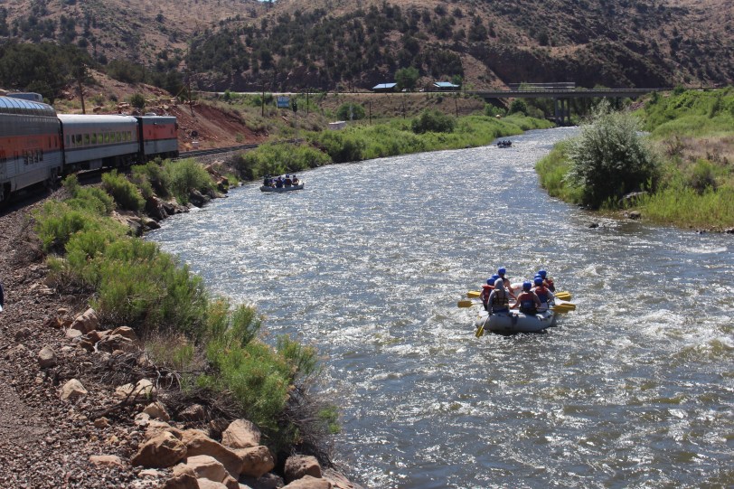 While we were enjoying the warm comfort of our indoor seating, we saw many rafts full of people enjoying the Arkansas in a colder and closer fashion. We did not envy them. We were particularly disturbed by the lone kayaker chasing an extra, empty kayak. Hopefully, all ended OK, as there were no tragic stories in the news. The rafters seemed to enjoy waving at the train passengers—and vice versa.