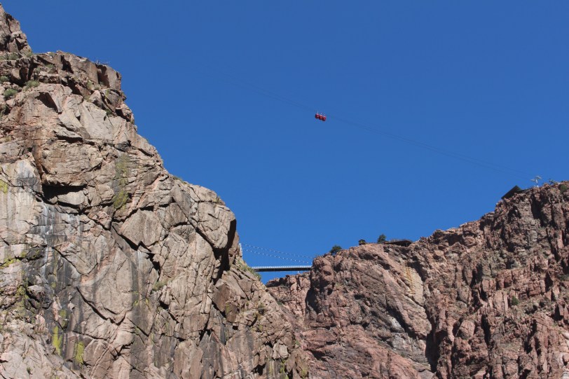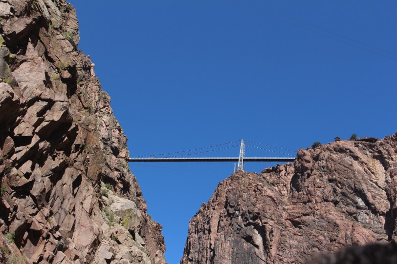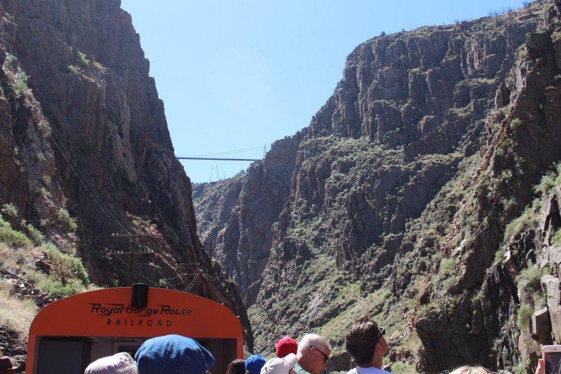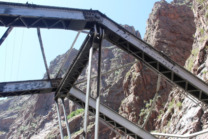 We enjoyed the scenery—and tasty San Luis Valley coffee—along the Arkansas for a while before ordering our entrées. They were tasty, but not huge, though we had enough for the moderately small appetites of our party (and we did have a first breakfast earlier). After breakfast, Mom decided to brave/enjoy the open-air car. Maureen joined her for a while, then switched off with me, and some nice shots of the canyon and bridge were captured.
