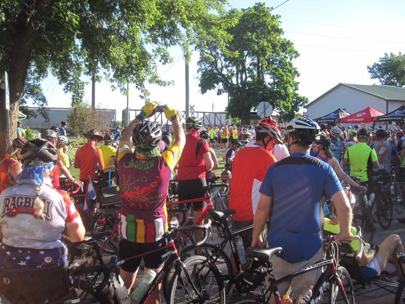 I ended up by myself because we started a little late, which put us in the actual thick of RAGBRAI riders. In fact, at the first pass-through town of Grand Junction, we came to a stop to wait for two trains, then stopped again several hundred feet later to cross a good-sized road. Then traffic was even thicker.