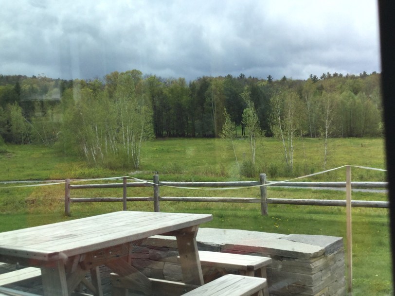 We drove downhill a bit and turned onto one of the roads that would lead us to the von Trapp Family Lodge. Yes, it’s that von Trapp family. After fleeing Austria right before World War II, Maria and George von Trapp settled in Vermont as it reminded them of Austria. They built a farm but in 1950 began accepting guests in their mountain home. It expanded to become a 90+ room lodge, but we felt it was a bit beyond our budget for this trip. And, we find we prefer the more personal touch we’re experiencing at the Brass Lantern, not to mention the breakfast menu that is customized to our dietary needs and preferences. We did check out the lodge, in part because we wanted to look at all the historical photos there. Although it’s high in the hills (no lonely goatherds spotted), the vistas were obstructed by the rain clouds so we didn’t get great views. However, the von Trapps have also created a Bierhall and brewery, and we’d already decided that would be our dining destination. We ended up hanging out there for a few hours with a great view (but no moose).