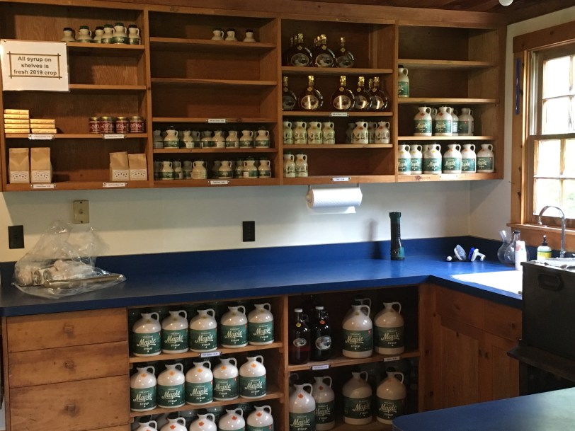 I’d never watched the glass blowing/making progress in person before and it was great even watching for a few minutes and seeing how complex the process seems to be. After leaving, we followed Moscow Road up to Nebraska Knoll, pausing to switch to 4-wheel-drive to carefully climb up the hilly, unpaved and rutted track. When you get to it, Nebraska Knoll Sugar Farm looks like an unassuming mountain house. A sign directed us to the adjacent building that is set up old-fashioned farm store style, with self-service maple syrup sampling and honor system purchasing of maple syrup and candies. They even had a self-service credit card setup! After trying the three varieties, we opted to pay cash for a half pint of the robust syrup, which had a delicious richness. We only bought a little since we have already bought enough goodies that we have to be judicious in how we pack to get it all home!